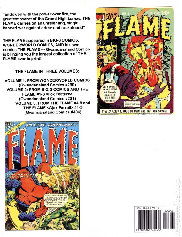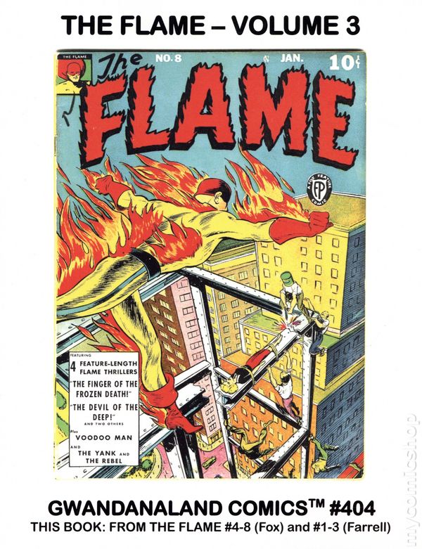 Volume 404 - 1st Printing. "The Flame Volume 3!" Collects Flame (1940 Fox Features Syndicate) #4-8 and Flame (1955 Ajax) #1-3. These budget friendly reprints of classic western sci-fi, horror, and adventure comics feature some of the best in public domain comic book reprints! Softcover, 8 1/2-in. x 11-in., 204 pages, full color.