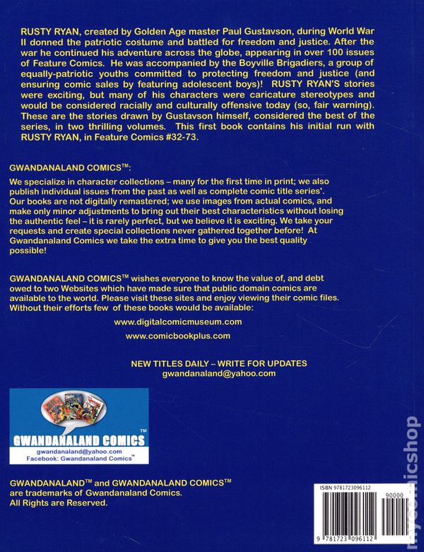 Volume 678 - 1st Printing. "Rusty Ryan - The Paul Gustavson Stories Volume 1!" Collects material from Feature Comics (1939 Quality) 32-73. These budget friendly reprints of classic western sci-fi, horror, and adventure comics feature some of the best in public domain comic book reprints. Softcover, 8 1/2-in. x 11-in., 184 pages, full color