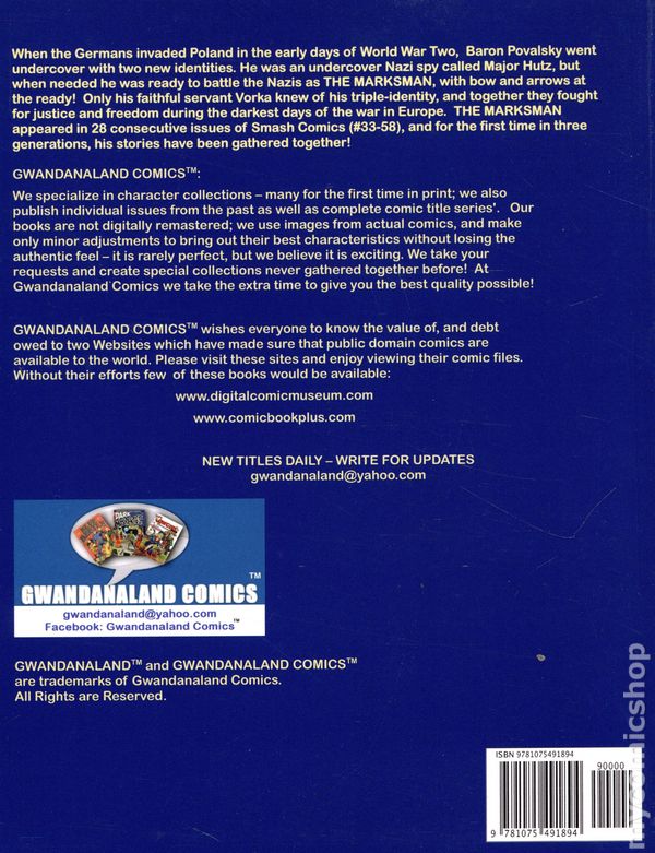 Volume 884 - 1st Printing. "The Complete Marksman!" Collects material from Smash Comics (1939 Quality) #33-58. These budget friendly reprints of classic western sci-fi, horror, and adventure comics feature some of the best in public domain comic book reprints. Softcover, 8 1/2-in. x 11-in., 37 pages, full color