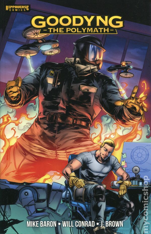 Volume 1 - 1st printing. Written by Mike Baron. Art by Will Conrad. Cover by Caanan White. Here comes Goodyng – the genius of Florespark! Cato Goodyng and his Goodyng Services burst into the Rippaverse in Isom #2 when he sprang into action and extinguished the flames on Silman Ranch caused by the mysterious Devlings. But who is this enigmatic innovator and inventor? Find out how a childhood prodigy became Goodyng: The Polymath in his very first solo sci-fi/adventure book! Written by industry legend, Mike Baron, with pencils by the incredible Will Conrad, Goodyng: The Polymath promises to be one hell of a ride! Mike Baron is known for his dark sense of humor, vast experience, and writing hard hitting characters and unforgettably edgy stories. Goodyng: The Polymath will mark the very first Rippaverse book written by this titan. This larger-than-life epic is skillfully brought to life by fan favorite, Will Conrad, making this team up with Mike Baron not a book to be missed! This is also an issue featuring special first appearances of several new characters, including one incomparable villain that is sure to give Cato Goodyng the fight of his life. Has Goodyng met his match? What awaits him in this edge of your seat thriller? Softcover, 72 pages, full color. Teen Cover price $21.00.