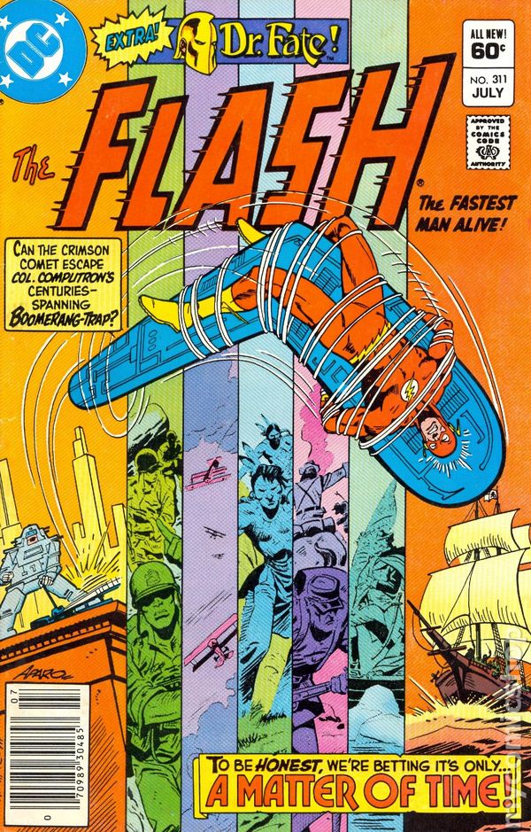Newsstand Edition. Cover art by Jim Aparo. Captives of the Boom-Boom Boomerang, script by Cary Bates, pencils by Carmine Infantino, inks by Frank Giacoia; Flash battles Colonel Computron and Captain Boomerang. Rogue Gods, script by Steve Gerber and Martin Pasko, pencils by Keith Giffen, inks by Larry Mahlstedt; Dr. Fate is trapped in a nightmarish, hallucinatory dimension. Ad from Moondance Comics. 36 Pages, Full Color. Cover price $0.60.
