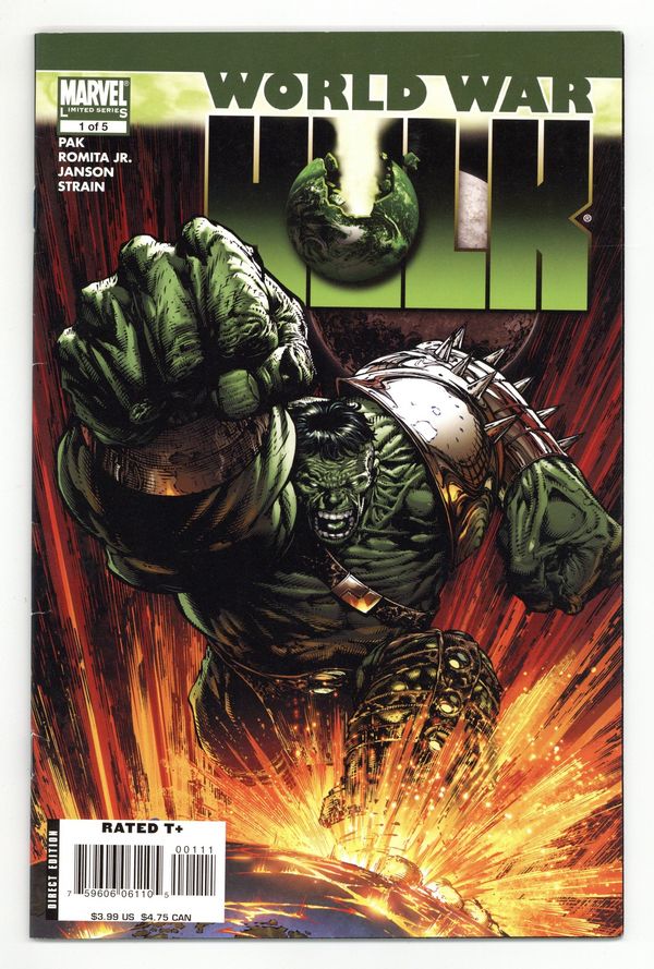 Tags: World War Hulk (part 2)$23.00Written by GREG PAK Penciled by JOHN ROMITA JR. Cover by DAVID FINCH Variant Cover by JOHN ROMITA JR. Marvel's massive summer smashfest begins! Exiled by a group of Marvel 'heroes' to the savage alien planet of Sakaar, the Hulk raged, bled and conquered through the pages of last year's 'Planet Hulk' epic, rising from slave to gladiator to king. Now the Hulk returns to Earth to wreak his terrible vengeance on Iron Man, Reed Richards, Dr. Strange and Black Bolt -- and anyone else who gets in his way. Stronger than ever, accompanied by his monstrous Warbound gladiator allies, and possessed by the fiercest and purest rage imaginable, the Hulk may just tear this stupid planet in half. The epic story of anger unbound begins with this special double-sized issue written by 'Planet Hulk' scribe Greg Pak and penciled by the legendary John Romita, Jr. 48 PGS./Rated T+ Cover price $3.99.