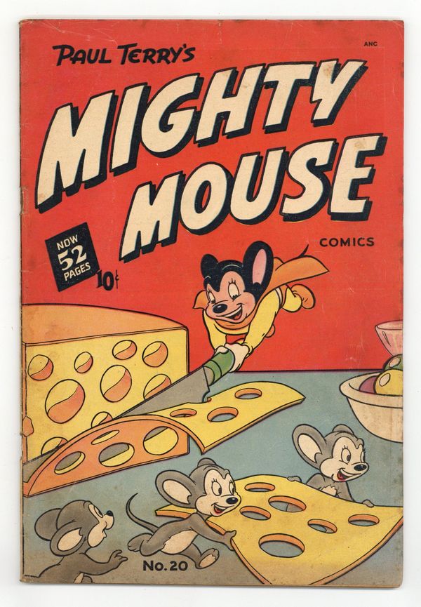 The world's mightiest mouse defends Mouseville from danger - mostly cats - in the comic-book adventures of the Terrytoons animated superhero. Mighty Mouse finds trouble at The Alley Cats' Convention. In his first appearance, the cat supervillain known as the Claw employs a Mighty Mouse impostor to frame MM for his crimes. But while Mighty Mouse is in prison, the Claw's gang runs wild in Terrytown. Sourpuss thinks Gandy's ventriloquism act could be the next great radio sensation. Heckle and Jeckle: A Helping Hand; The Perils of Pearl Pureheart; Dinky; Sourpuss: The Boomerang; Gandy Goose: Hidden Talent; Mighty Mouse Meets the Claw; Gandy and Sourpuss: Sourpuss Finds a Wallet; The Alley Cats' Convention; Mighty Mouse Plays Peacemaker. 48 pages, Full Color. Cover price $0.10.