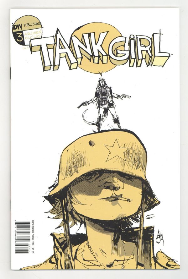 Published Jul 2007 by IDW Publishing.$20.00Cover by Ashley Wood. Alan C. Martin (w); Ashley Wood (a & c) 'Please, Mr. Comic Store Owner, where can I find a comic book that offers schoolboy humour, unbridled slapstick violence, totally unnecessary swearing, and a woman with big honkers and a grenade pin between her teeth?' 'Why, that's simple, little Jimmy. You're looking for Tank Girl: The Gifting issue 3 by Ashley Wood and Alan C. Martin. There you go. Now run along. And don't tell your mum.' Cover price $3.99.