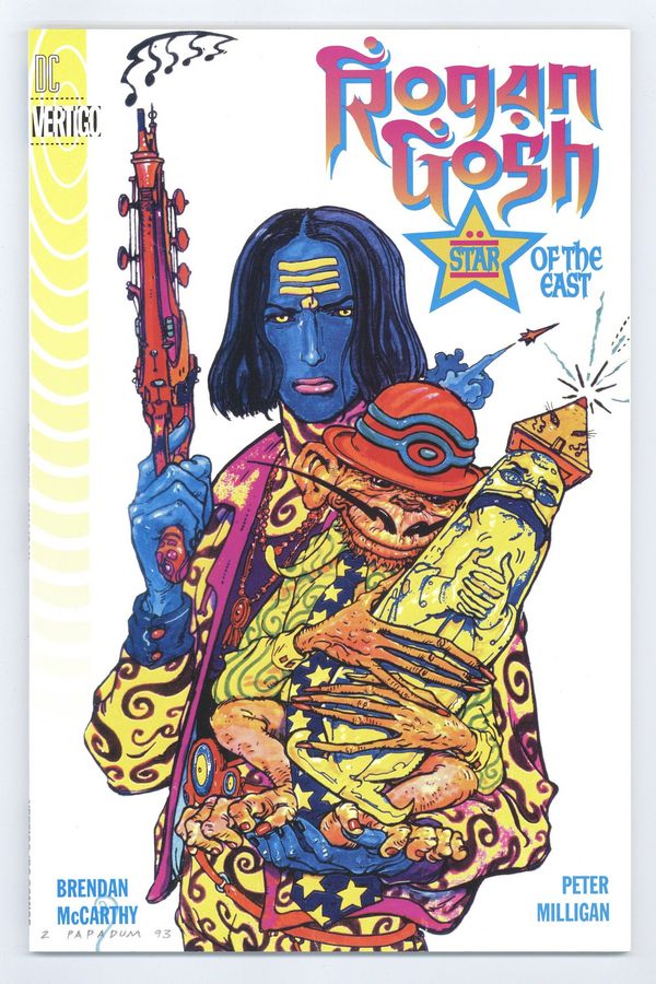 Published 1994 by DC/Vertigo.$14.00Slip the bounds of Reality; let fall the veils of Illusion; see the Truth and enter the world of ROGAN GOSH. Be prepared for the experience of a lifetime as one of the most dazzlingly original comics ever published makes its North American debut. ROGAN GOSH is a psychedelic adventure through Rudyard Kipling's opium dreams, past modern-day London, and into a futuristic India where an extraordinary creature called Rogan Gosh awaits. It's a story that combines Hindu mysticism with science fiction, and spiritual enlightenment with lavishly written Indian restaurant menus. Originally published as a serial in the British anthology 'Revolver,' ROGAN GOSH features a story by Brendan McCarthy and Peter Milligan. McCarthy also provides the lavish illustrations, scripted by Milligan. With a foreword by McCarthy and an afterword by Milligan, along with never-seen character sketches, this 56-page one-shot will mesmerize any reader looking for a comic-book experience beyond the norm. Painted cover by McCarthy. Suggested for Mature Readers. Contains strong language. Prestige Format. Cover price $6.95.