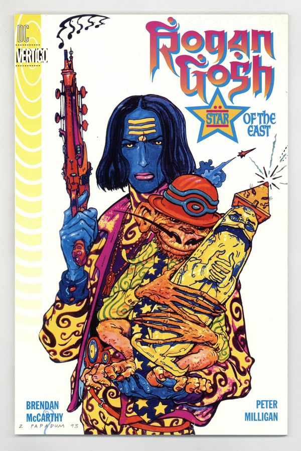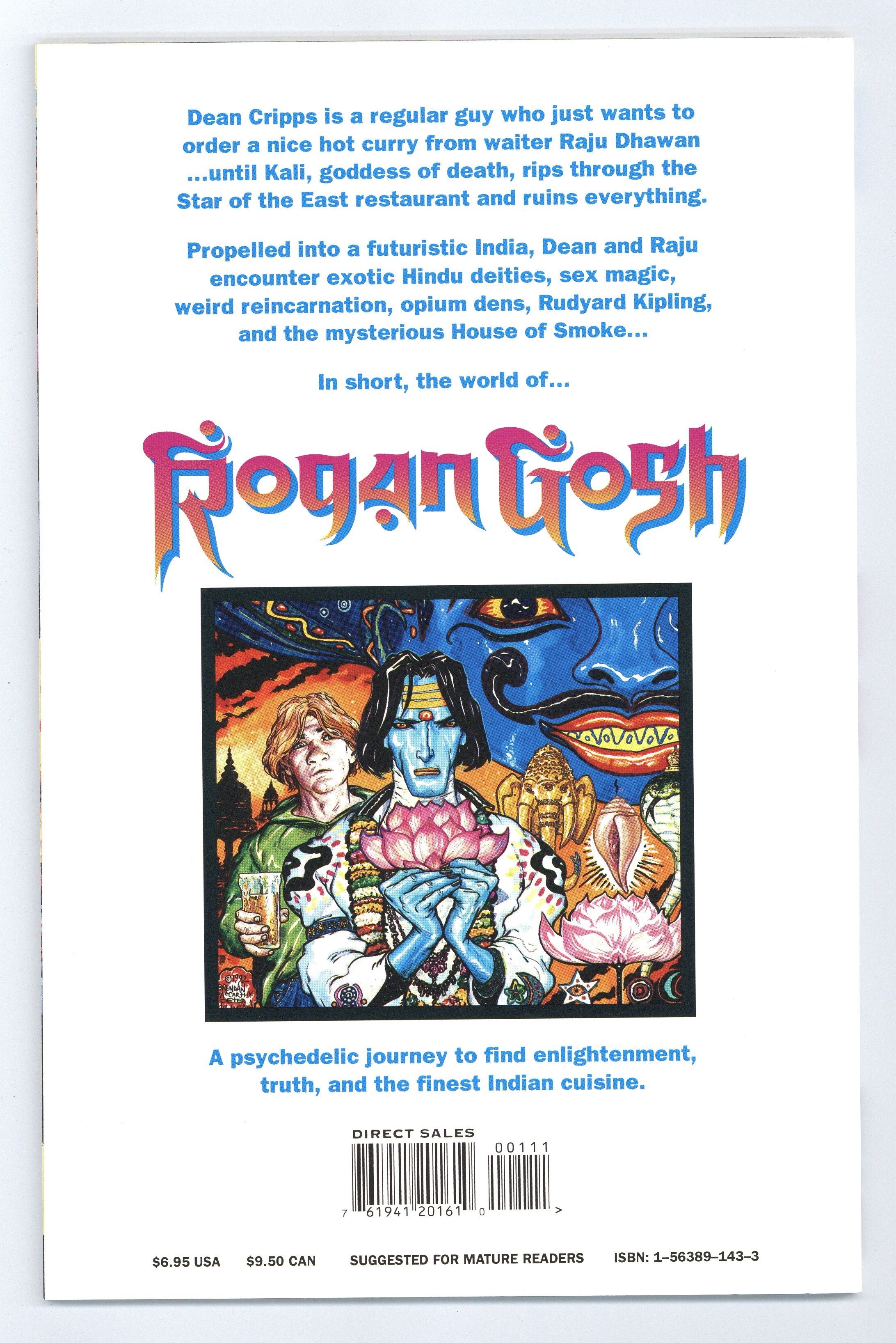 Published 1994 by DC/Vertigo.$16.00Slip the bounds of Reality; let fall the veils of Illusion; see the Truth and enter the world of ROGAN GOSH. Be prepared for the experience of a lifetime as one of the most dazzlingly original comics ever published makes its North American debut. ROGAN GOSH is a psychedelic adventure through Rudyard Kipling's opium dreams, past modern-day London, and into a futuristic India where an extraordinary creature called Rogan Gosh awaits. It's a story that combines Hindu mysticism with science fiction, and spiritual enlightenment with lavishly written Indian restaurant menus. Originally published as a serial in the British anthology 'Revolver,' ROGAN GOSH features a story by Brendan McCarthy and Peter Milligan. McCarthy also provides the lavish illustrations, scripted by Milligan. With a foreword by McCarthy and an afterword by Milligan, along with never-seen character sketches, this 56-page one-shot will mesmerize any reader looking for a comic-book experience beyond the norm. Painted cover by McCarthy. Suggested for Mature Readers. Contains strong language. Prestige Format. Cover price $6.95.