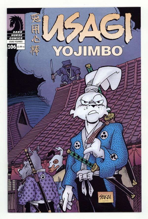 Published Sep 2007 by Dark Horse.$12.00Boss Bakuchi, eager to avenge the death of his son, has placed an extraordinarily large reward on the head of Inazuma. By doing so, he has signed the death warrant for more than a few greedy bounty hunters, as Inazuma is actually possessed by the terrible demon Jei, The Black Soul! Wounded and relentlessly pursued, Inazuma has retreated to a peasant's hut. It is there that Gen and Stray Dog encounter the mysterious samurai, along with a band of competing bounty hunters. Desperate to win their reward, and none too interested in sharing it, Gen and Stray Dog soon find themselves at the heart of a heated battle. Rarely impressed by the skills of other warriors, the two bounty hunters are nothing short of awestruck upon witnessing Inazuma's skills. Then, just as this deadly brawl is about to escalate out of control, the rabbit ronin Usagi arrives! Cover price $2.99.