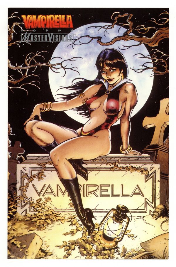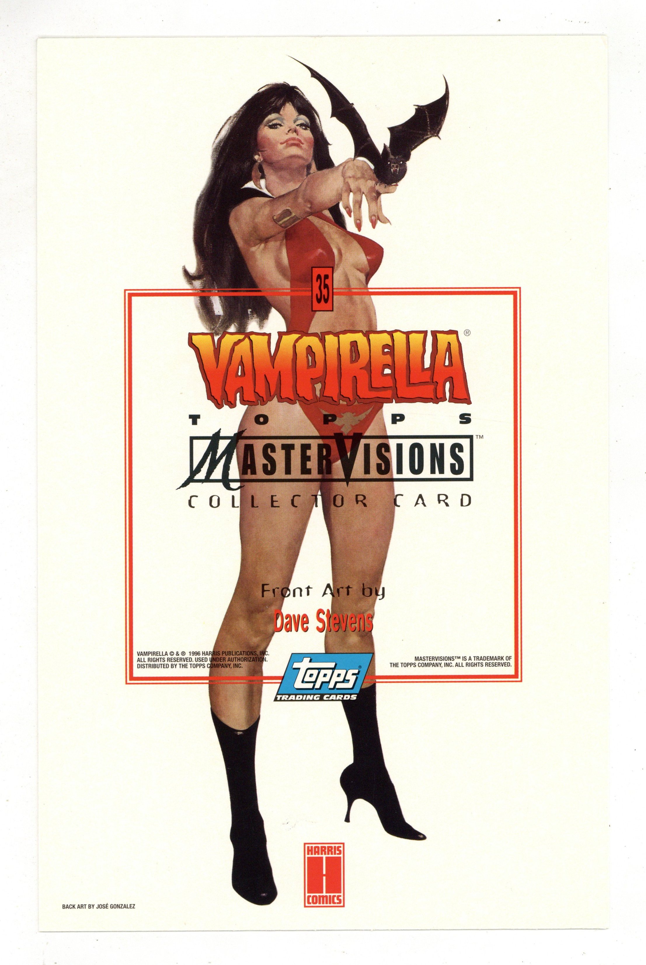 $27.00#35 in a set of 36 jumbo trading cards by Topps. Each card features a different artist (some artists repeat). Featured art by: Dave Stevens. Back of card features an advertisement for the Vampirella Topps Master Visions Collector Cards series. Measures 6-1/2" x 10-1/4"