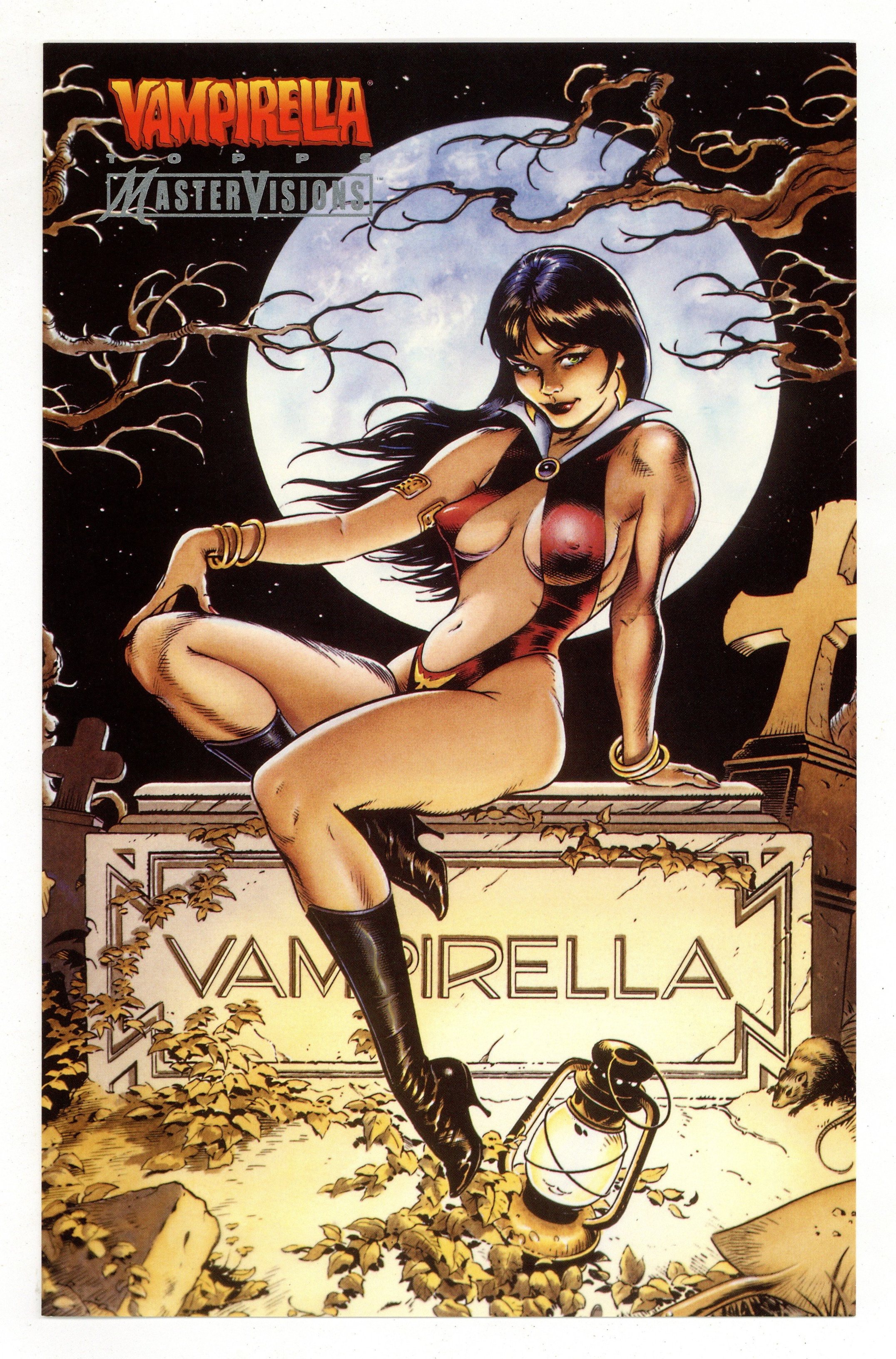 $26.00#35 in a set of 36 jumbo trading cards by Topps. Each card features a different artist (some artists repeat). Featured art by: Dave Stevens. Back of card features an advertisement for the Vampirella Topps Master Visions Collector Cards series. Measures 6-1/2" x 10-1/4"