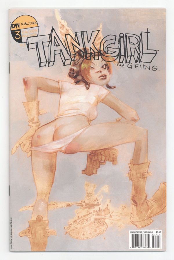 Published Jul 2007 by IDW Publishing.$75.00Cover by Jamie Hewlett. Alan C. Martin (w); Ashley Wood (a & c) 'Please, Mr. Comic Store Owner, where can I find a comic book that offers schoolboy humour, unbridled slapstick violence, totally unnecessary swearing, and a woman with big honkers and a grenade pin between her teeth?' 'Why, that's simple, little Jimmy. You're looking for Tank Girl: The Gifting issue 3 by Ashley Wood and Alan C. Martin. There you go. Now run along. And don't tell your mum.' Cover price $3.99.