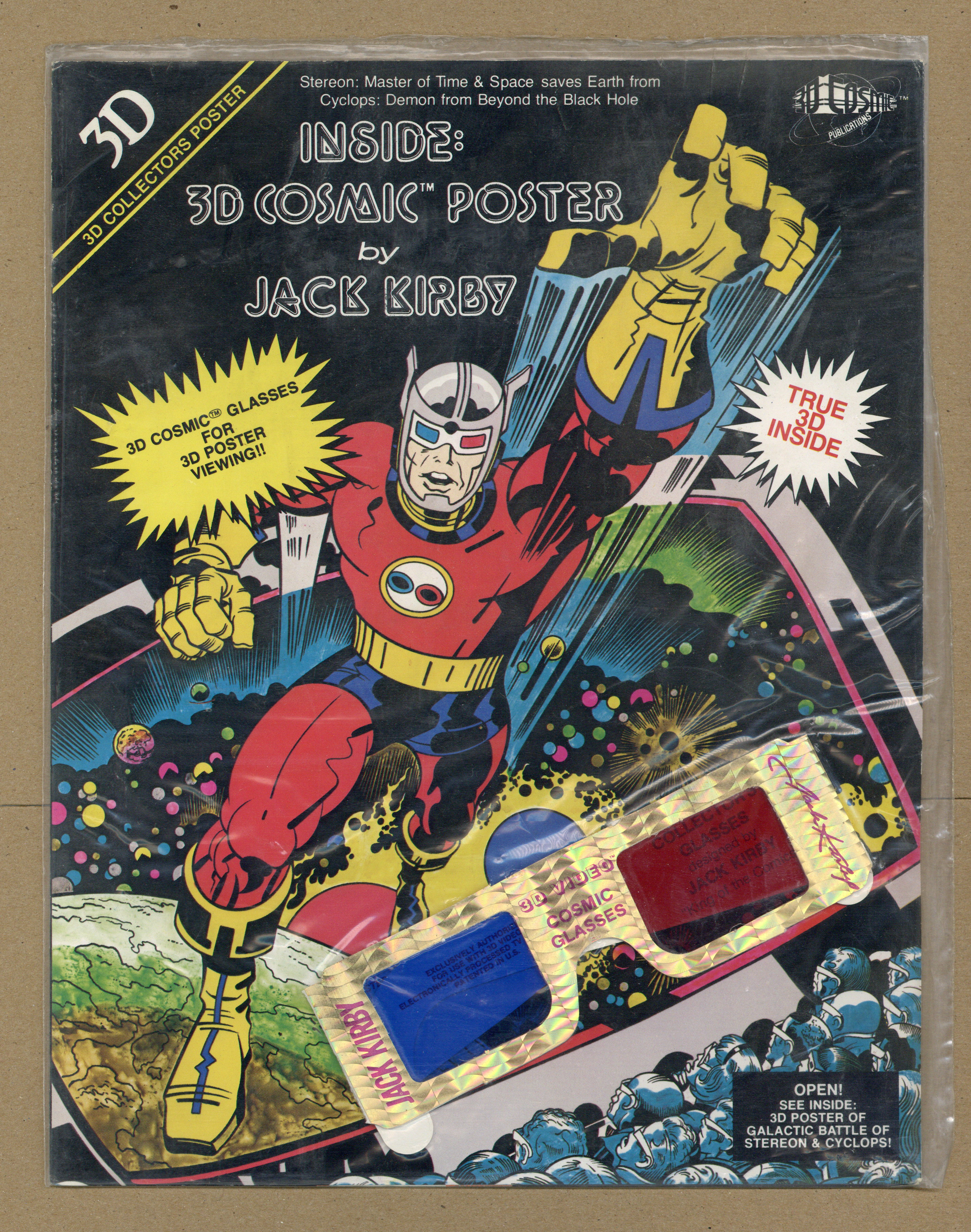 Tags: 3-D Comic$5.003D Collector's Poster by Jack Kirby. "Galactic Battle of Stereon and Cyclops and featuring Jack Kirby 3D Cosmic Glasses." Back says "Coming Soon! 3D Cosmic Book by Jack Kirby Featuring: The Battle for a Three Dimensional World Stereon vs. Cyclops." No original cover price. Includes glasses; 11"x17" poster.