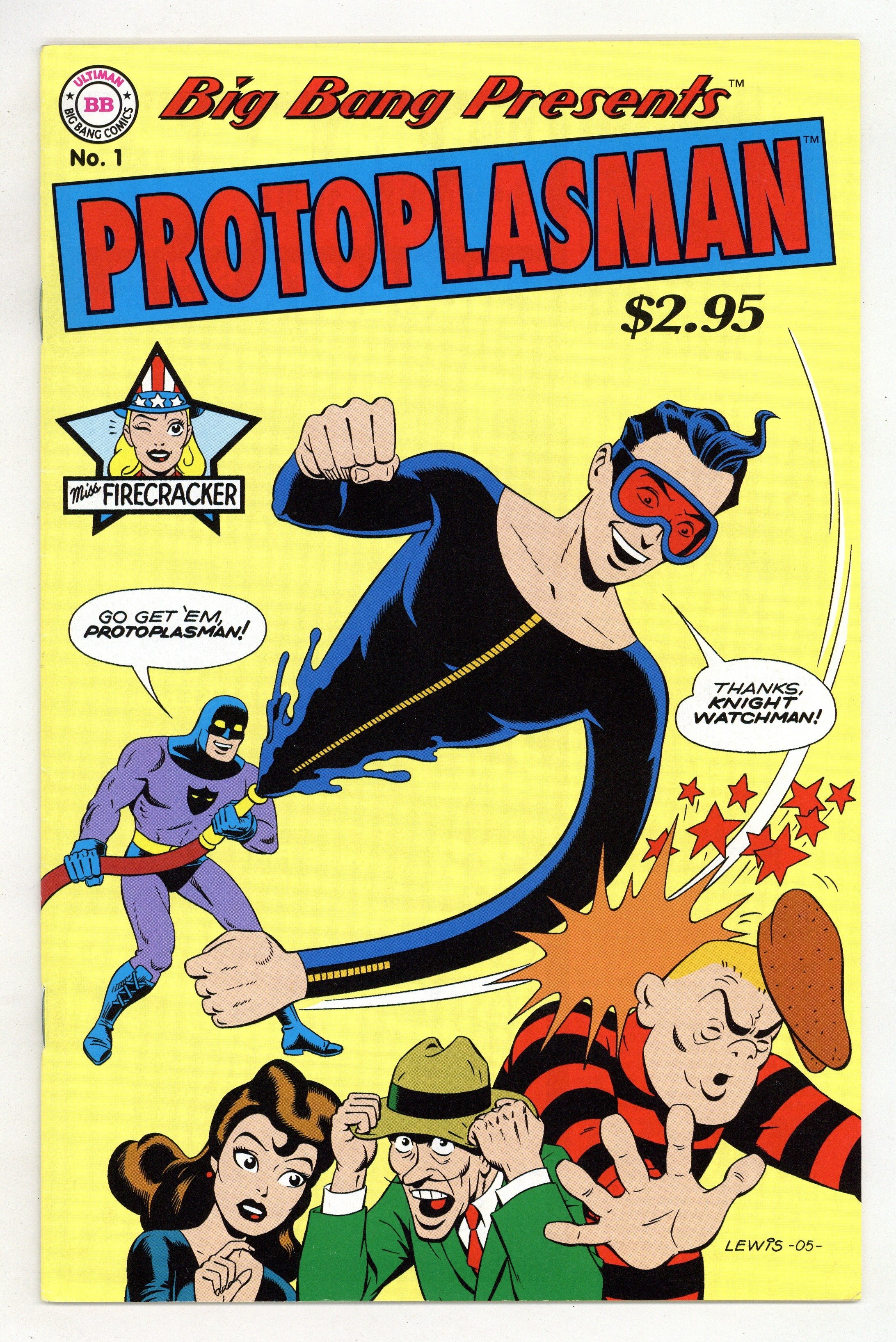 $17.50Cover art by Mark Lewis. The Camera of Doom starring Knight Watchman, script by Gary Carlson, art by Jeff Austin; Will Eisner Spirit tribute. Gary Carlson discusses Big Bang's departure from Image Comics and upcoming Big Bang stories. Super Frankenstein, script and art by Bill Fugate. Miss Firecracker illustration, pencils by Mike Worley, inks by Jeff Austin. Protoplasman pinup by Mort Todd; Jack Cole Plastic Man and Police Comics tribute. 36 pgs. $2.95. Cover price $2.95.