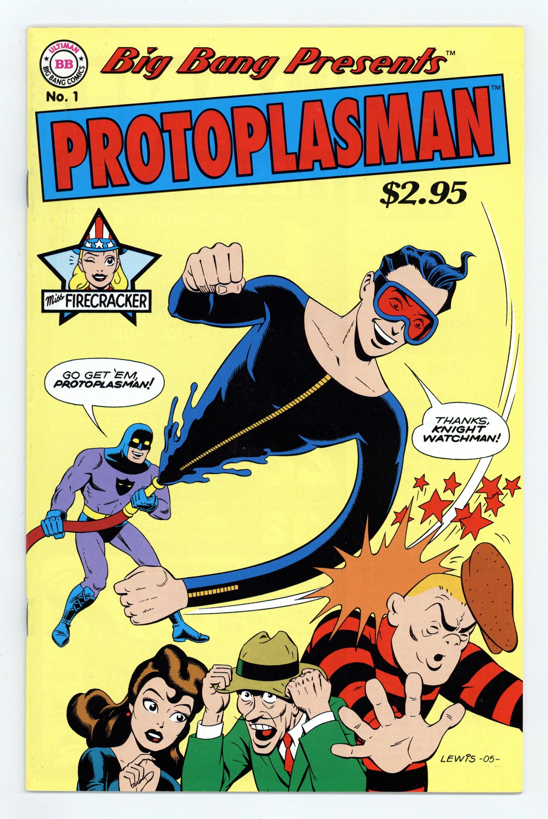 $16.25Cover art by Mark Lewis. The Camera of Doom starring Knight Watchman, script by Gary Carlson, art by Jeff Austin; Will Eisner Spirit tribute. Gary Carlson discusses Big Bang's departure from Image Comics and upcoming Big Bang stories. Super Frankenstein, script and art by Bill Fugate. Miss Firecracker illustration, pencils by Mike Worley, inks by Jeff Austin. Protoplasman pinup by Mort Todd; Jack Cole Plastic Man and Police Comics tribute. 36 pgs. $2.95. Cover price $2.95.