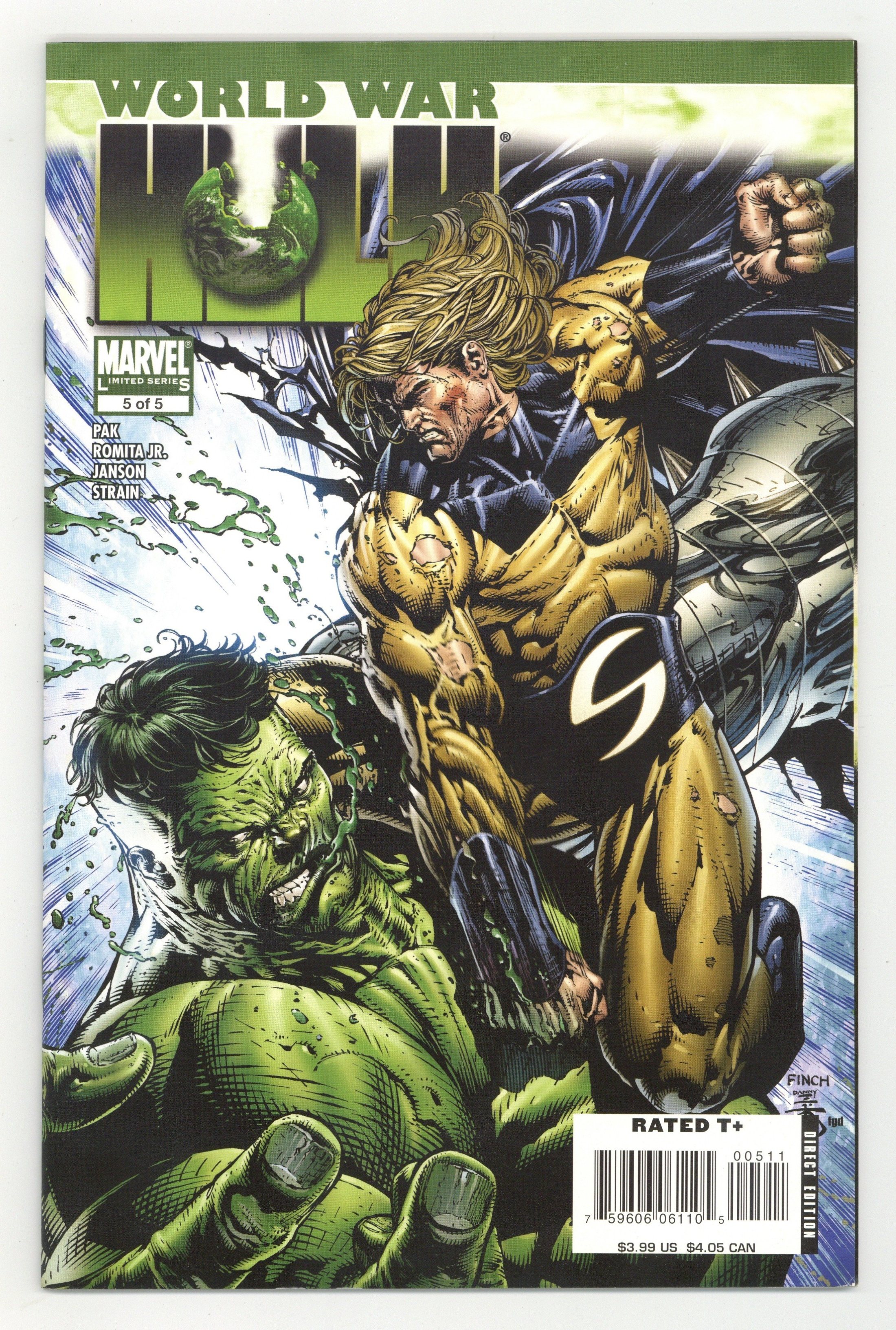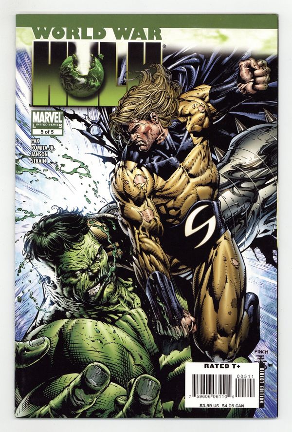 Written by GREG PAK Pencils by JOHN ROMITA JR. Cover by DAVID FINCH. The millennium's most massive Marvel smashfest careens towards its cataclysmic conclusion! Four so-called Marvel 'heroes' shot the Hulk into space. Their exploding shuttle destroyed his people and pregnant queen. And the Hulk has taught them what their arrogance has wrought. But now the Hulk faces the puny humans' greatest champion. And as the terrible battle rages, who will stand revealed as the hero - and who will be proved the monster? Who knows the difference between vengeance and justice? And who will pay the terrible price of anger? Cover price $3.99.