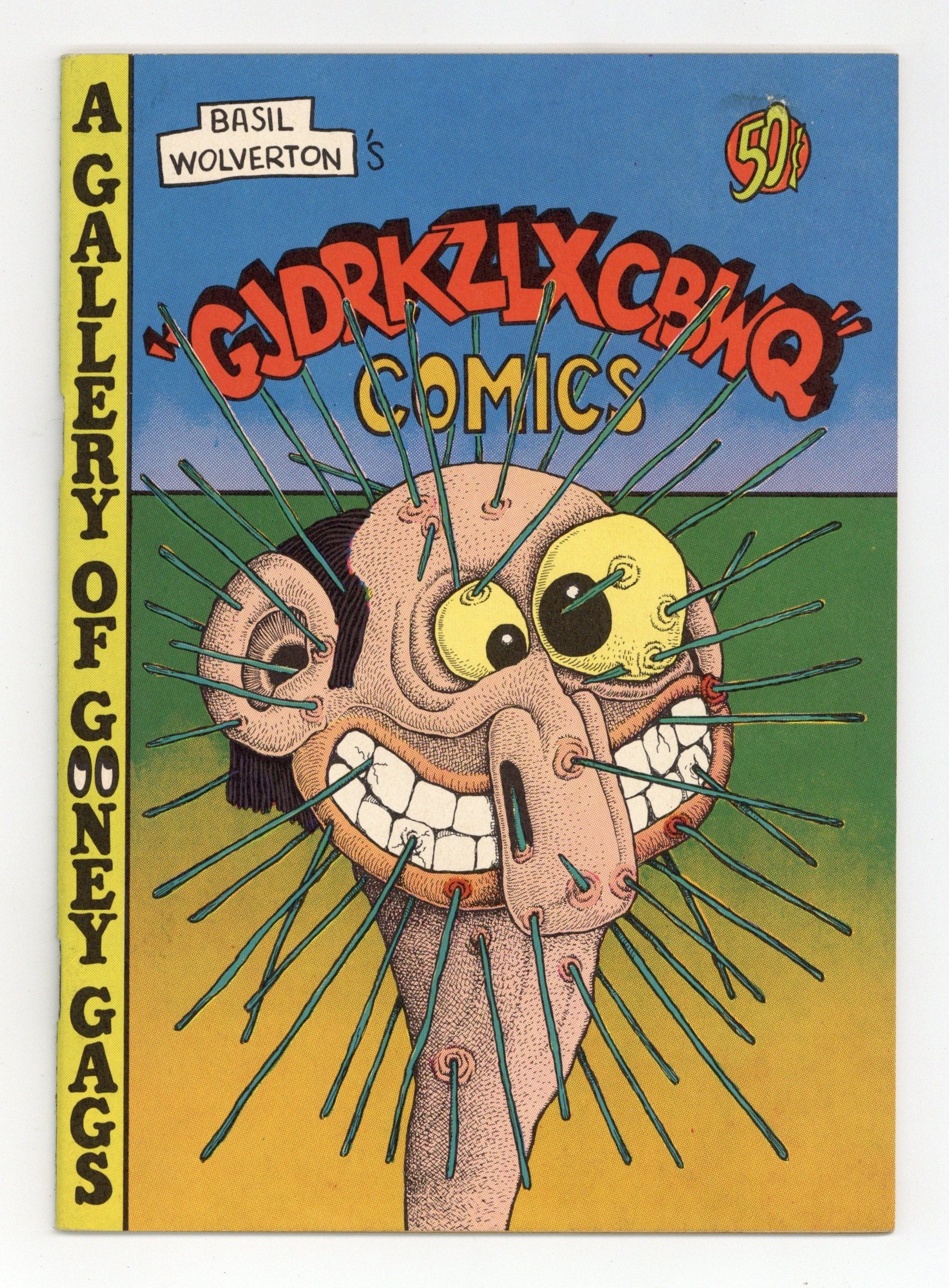 Gjdrkzlxcbwq Comics (1975), 36 pages of pure Basil Wolverton's bizarre pinups of Plop-like freaks, mutants and general weirdos. 5 1/4" x 7 1/4"; color cover with black-and-white interior. Publisher: Glenn Bray. Cover price $0.50.