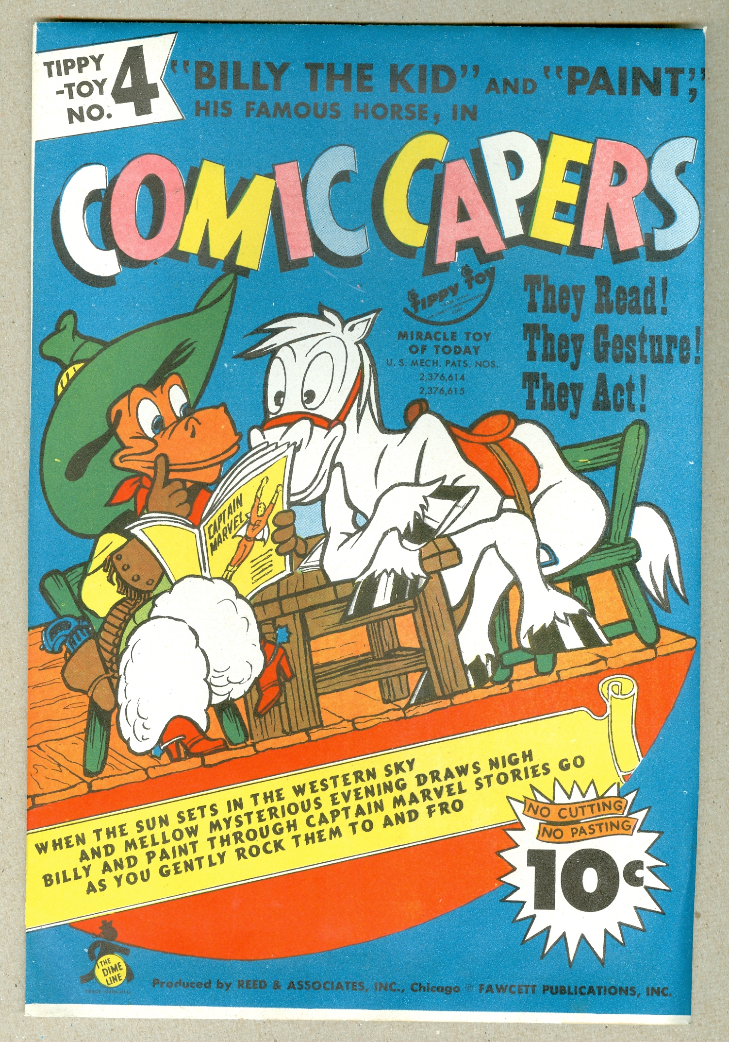 Tags: Tippy Toys$4.00Circa early 1940's. Tippy-Toy No. 4 in a series for the easily amused. Marvel at this "Miracle Toy of Today" -- pieces of cardboard that YOU can punch out and put together! Then amaze yourself, your relatives, and possibly your friends as you gently rock Billy the Kid and his horse Paint while they read a Captain Marvel comic book. No cutting or pasting required. Cover price $0.10.