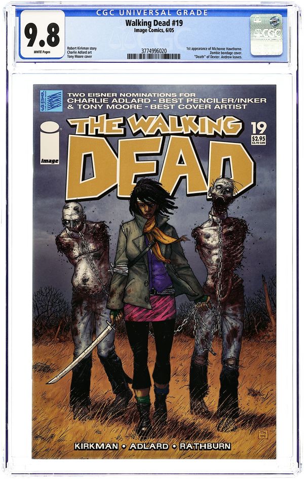 First appearance of Michonne. Zombie bondage cover. Written by ROBERT KIRKMAN, art by CHARLIE ADLARD, and cover by TONY MOORE. The group has a visitor, but is she friend, foe or worse? Where did she come from? How did she survive? Can she be trusted? This is the beginning of a new story arc, an excellent jumping-on point for new readers. The quest to rebuild civilization starts here. Cover price $2.95.