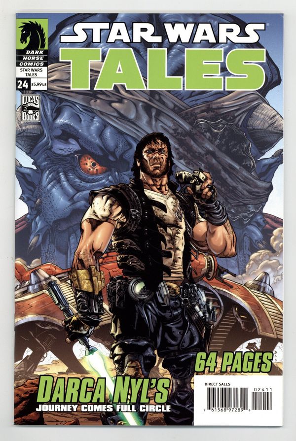 Tags: Star WarsPublished Jun 2005 by Dark Horse.$49.00ROB WILLIAMS (W), LUCAS MARANGON (W/A), BRANDON BADEAUX (A), and various, TBA (Cover) and Photo cover On sale June 8, FC, 64pg, $5.99. Powerful is the dark side of the Force; its corrupting, seductive pull has produced some of the most memorable villains in the Star Wars galaxy. Exploring the moral and emotional fall-out that comes with giving oneself over to the ways of the Sith, this issue features four stories steeped in darkness and danger, spanning nearly every Star Wars era, including the final act of our serialized tale, "Nomad." The truth about wandering Jedi Darca Nyl is at last revealed, but will the end of his journey bring him peace ... or even more trouble? The premier Star Wars comics anthology rolls onward. Cover price $5.99.