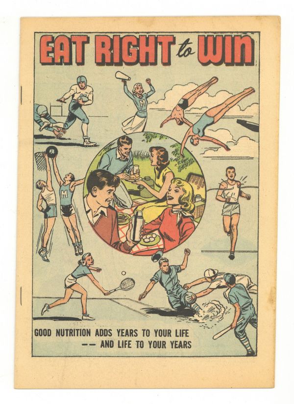 Eat Right to Win (1952) was a promotional comic book published by Swift & Company. Bobby and Betty learn the importance of a well balanced diet. Nutritional eating habits can help keep your energy level up and keep the body strong to endure the rigors of high school athletics. 16 pages, full color, newsprint, 7-in. x 10-in.
