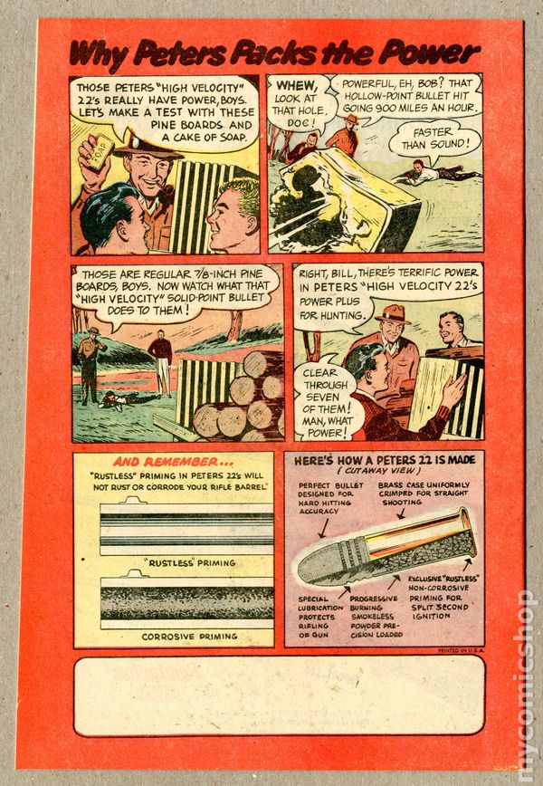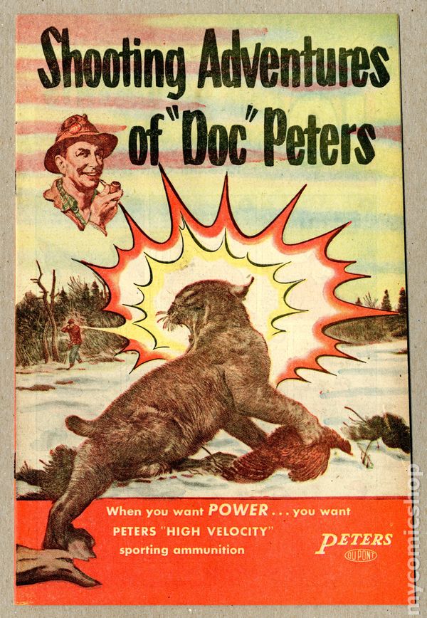 Shooting Adventures of "Doc" Peters (1953) was a promotional comic book published by the Peters Cartridge Division of Dupont. An early giveaway promoting guns and ammo. 16 pages, full color, newsprint, 6.5-in. x 10-in.