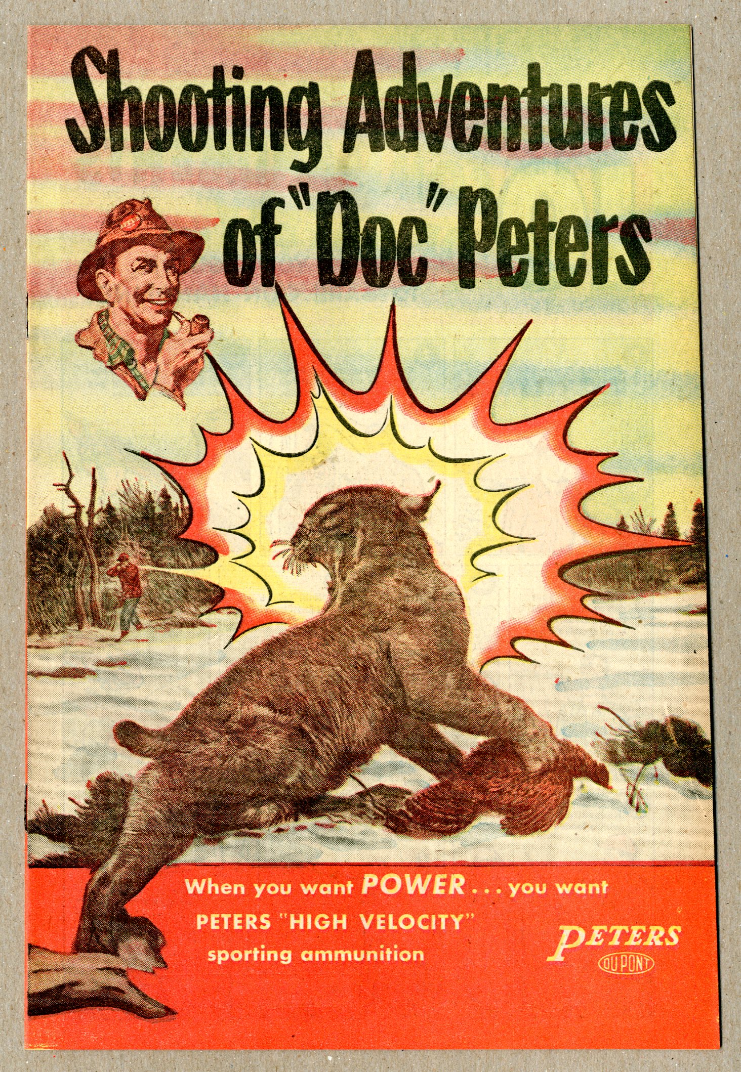Published 1953 by Peter Cartridge Division.$2.50Shooting Adventures of "Doc" Peters (1953) was a promotional comic book published by the Peters Cartridge Division of Dupont. An early giveaway promoting guns and ammo. 16 pages, full color, newsprint, 6.5-in. x 10-in.