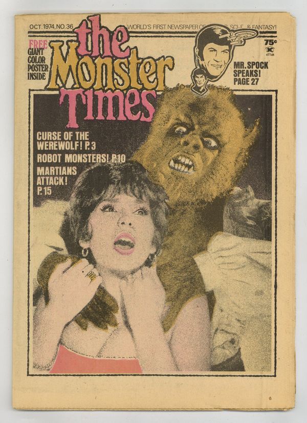 The World's First Newspaper of Horror, Sci-Fi and Fantasy! This issue: Mr. Spock Speaks! Curse of the Werewolf! Robot Monsters! Martians Attack! Plus - Free Giant Color Poster Inside. Cover price $0.75.