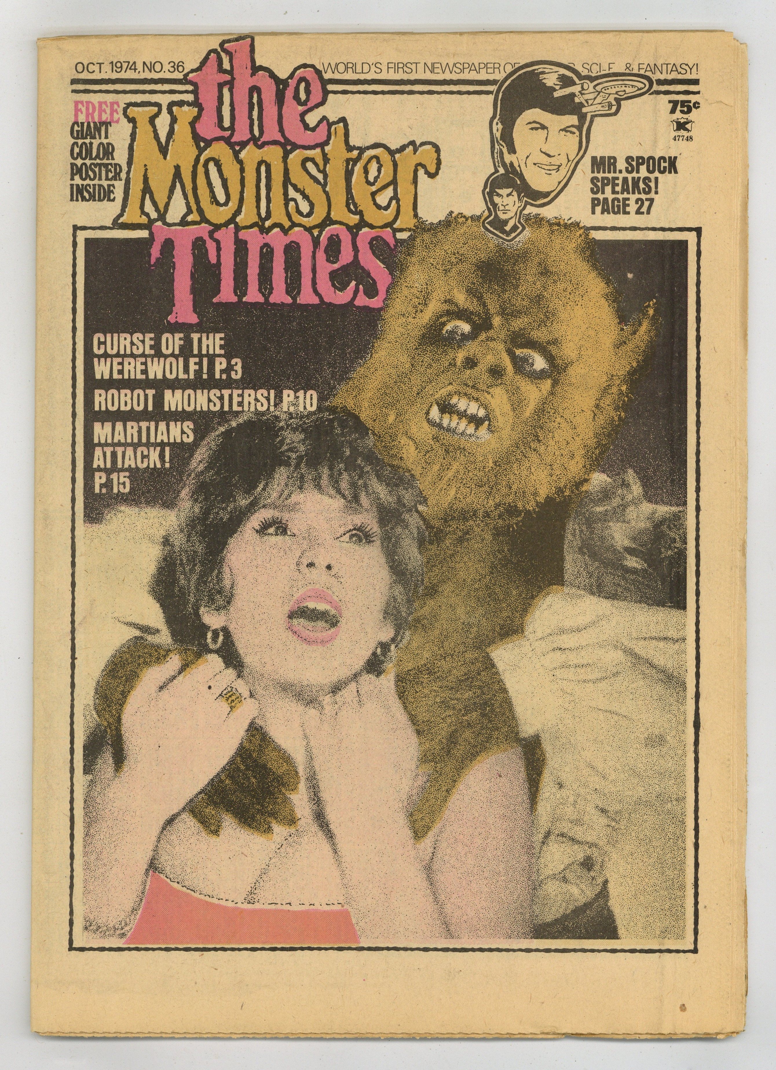Tags: Star TrekPublished Aug 1974 by Monster Times Publishing.$29.00The World's First Newspaper of Horror, Sci-Fi and Fantasy! This issue: Mr. Spock Speaks! Curse of the Werewolf! Robot Monsters! Martians Attack! Plus - Free Giant Color Poster Inside. Cover price $0.75.