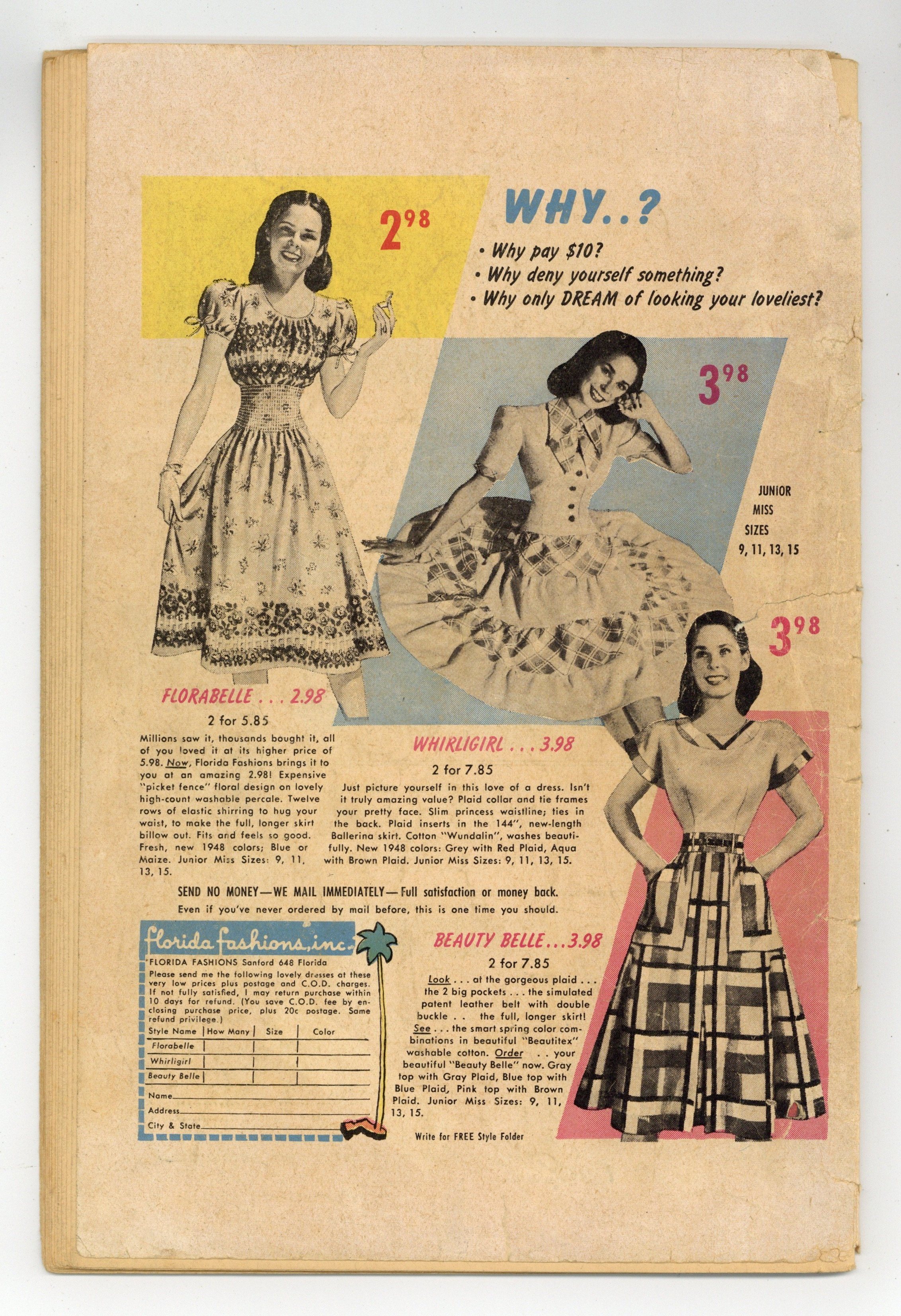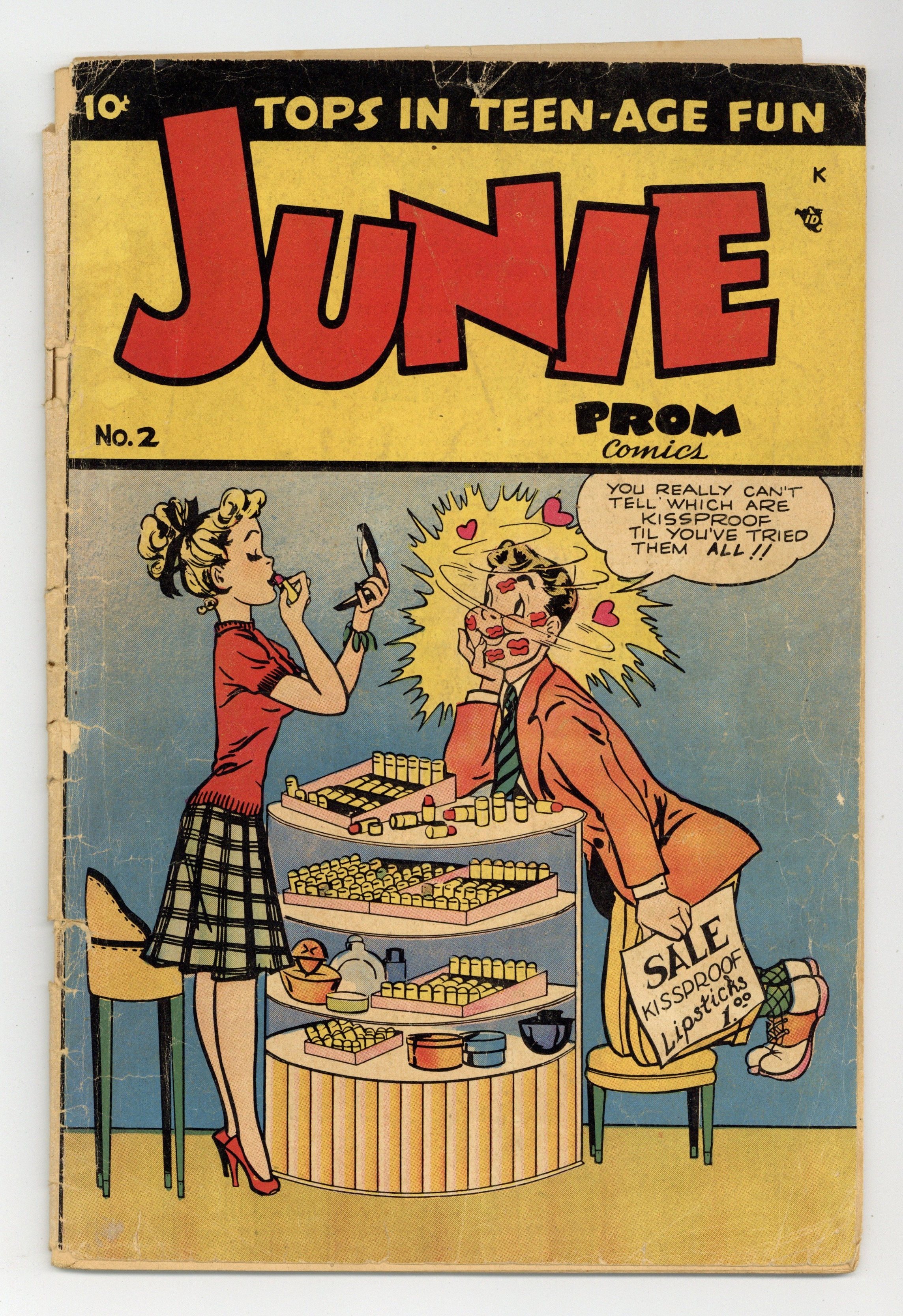 Stories and art by Paula Giokaris and others. Teen-humor comics featuring the misadventures of Junie and her gal-pals. Lollie and Junie learn that teen heartthrob Andy Brussel will be passing through town, but mean Drucilla wants him all to herself. Junie has trouble catching a man for the Sadie Hawkins-like "Pin-Up Dance." Dexter joins Jill and her father on a hayride, but her dad doesn't like him, his saxophone, or his knack for accidents. Plus fashion pin-ups starring Junie and her pals. Dreamboat with Whiskers!; Dream Duds for Junie; Pin-Up Boy!; Dessy and the Diary; Baby-Sitter!; Frocks for Fun; Dexter: Hectic Hayride. 36 pages, Full Color. Cover price $0.10.