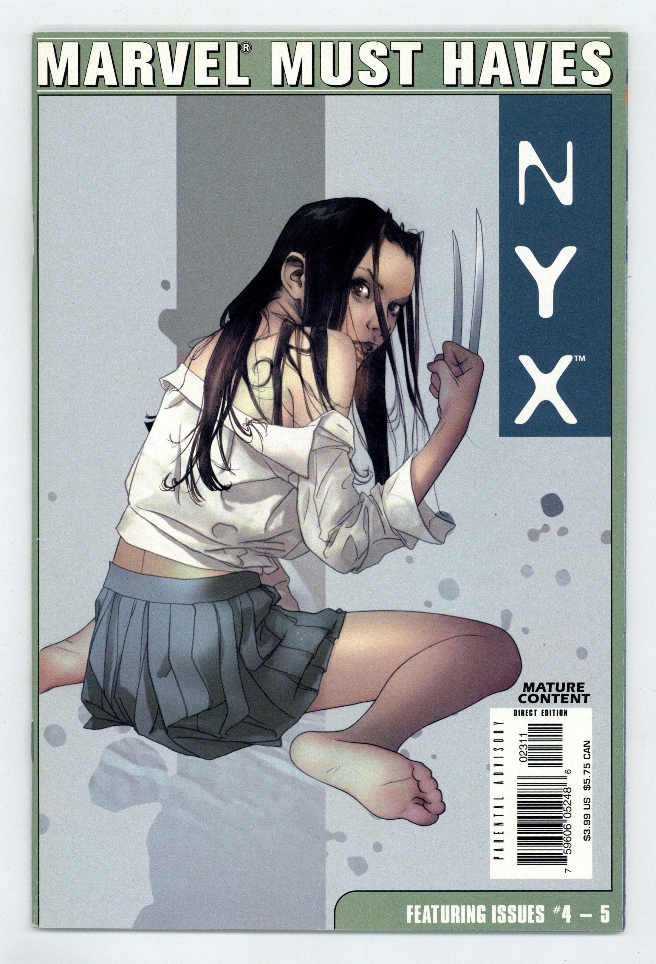 Written by JOE QUESADA Pencils JOSHUA MIDDLETON & ROB TERANISHI Cover by JOSHUA MIDDLETON Reprinting the sold-out NYX #4-5, in time for next month's NYX #6 ? plus all-new, never-before-seen extras! With a penchant for attracting strays, newcomer Tatiana picks up more than she bargained for when she manifests a striking mutant ability and catches the attention of Kiden's wayward gang. Plus: What if you could become anyone in the world for a day? What would you do? Who would you be? Captain America fighting alongside the Avengers? Bono during a concert in Wembley Stadium? Meet a young mutant who doesn't have to wonder. His powers let him be anyone he wants, and he isn't shy about using them! 80 PGS./ Parental Advisory ...$3.99 Cover price $3.99.