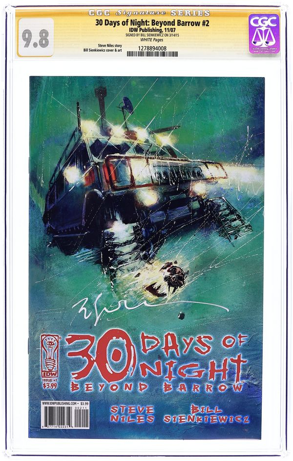 Written by Steve Niles. Arty by Bill Sienkiewicz. In the nightmarish darkness called the Arctic Feeding Ground, a glimmer of hope is wiped away with a bloody gnash. Our explorer's naïve vacation has turned into a fight for survival, and the mostly unlikely savior will walk from the tundra to lend aid. Steve Niles and Bill Sienkiewicz continue their chilling vampiric tale. 32 pages, full color. Cover price $3.99.