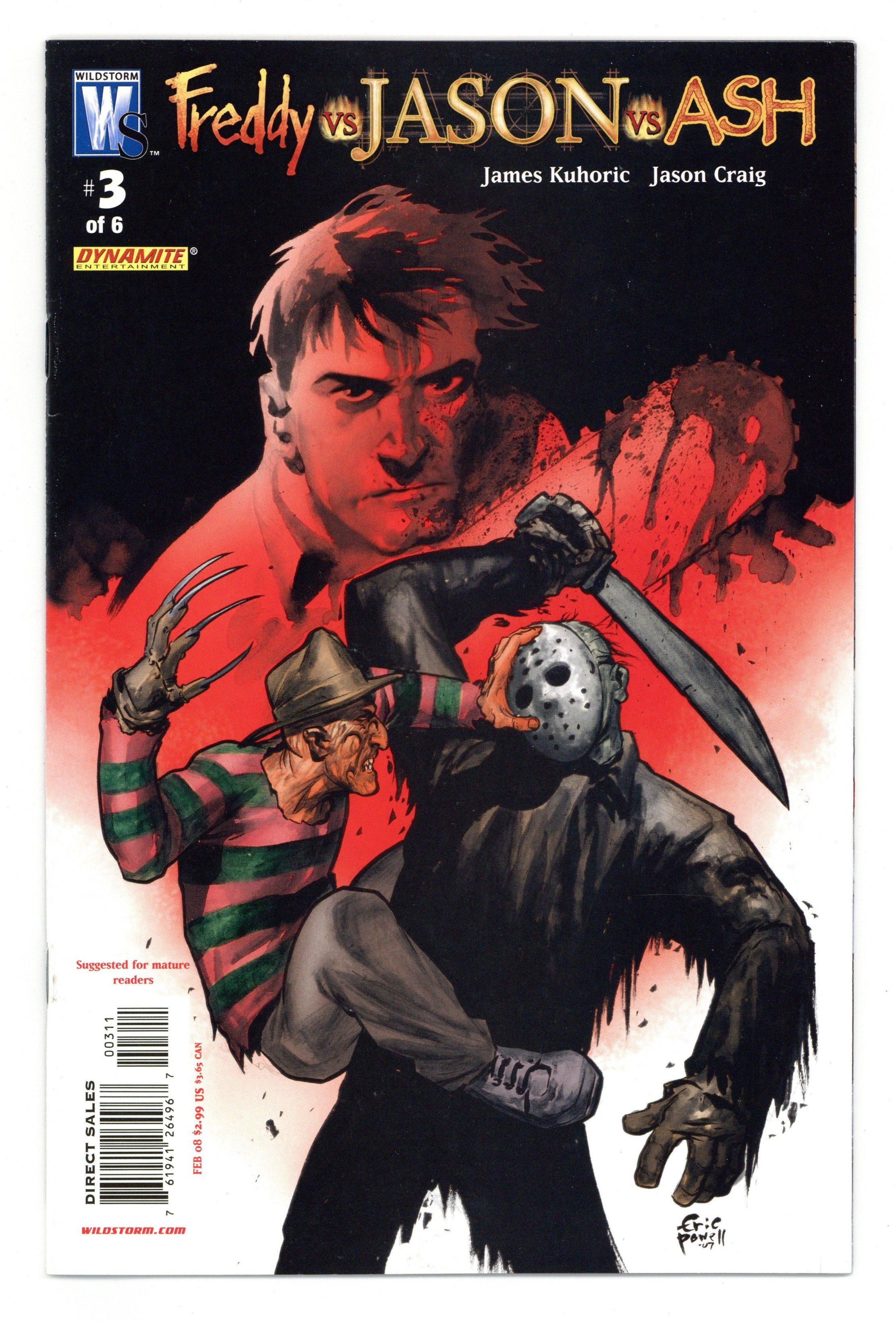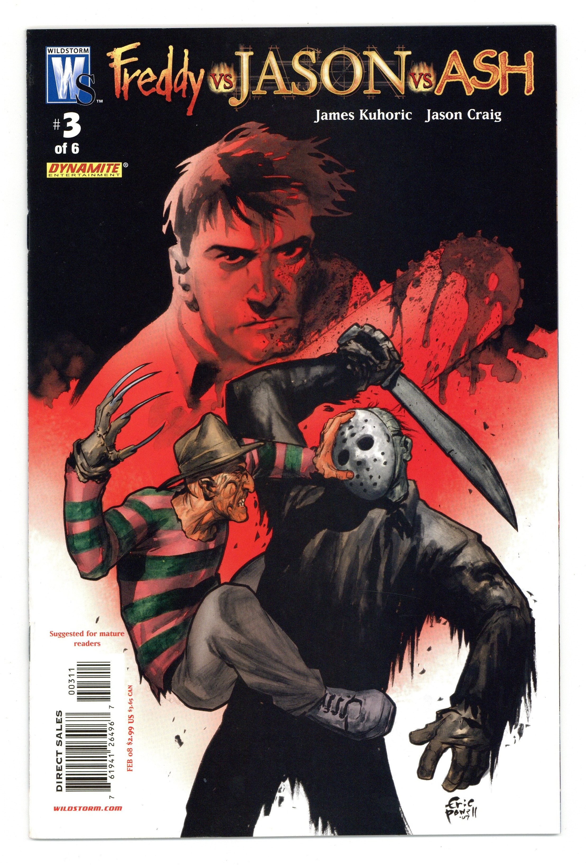 Published Feb 2008 by DC/Wildstorm.$21.00First Printing. Story by Jeff Katz Written by James Kuhoric Art by Jason Craig Cover by Eric Powell The madness continues! Freddy manipulates Jason into battling Ash for the Necronomicon...and if Jason gets it, Freddy will once more be free to wreak havoc! Cover price $2.99.