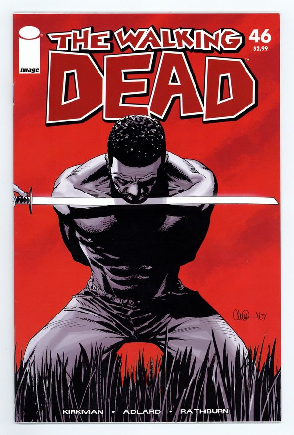 $20.00Written by Robert Kirkman. Art and Cover by Charlie Adlard and Cliff Rathburn. The bloodbath continues. No one is safe. Characters in this issue: Gabe; The Governor; Michonne; Rick Grimes; Lori Grimes; Herschel; Billy; Carl Grimes; Alice; Patricia; Axel; Tyreese. 32 pages, B&W (gray tones). RETAILER WARNING: MAY NOT BE SUITABLE FOR ALL AGES Cover price $2.99.