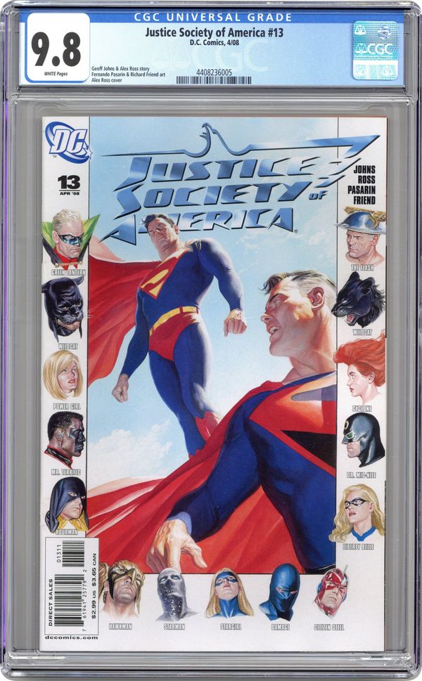 Cover by Alex Ross. Thy Kingdom Come: Part 4 of 6 - Written by Geoff Johns & Alex Ross Art by Fernando Pasarin & Richard Friend, with half a page painted by Alex Ross. 'Thy Kingdom Come' continues! The Justice Society has been tracking the 'Heartbreak Slayer' - a mysterious serial killer targeting super-villains - for months. Now, as new members are welcomed into the fold and the Society expands, the JSA will come face-to-face with an evil that threatens the future they stand for. This issue will ship with two covers. For every 10 copies of the Standard Edition (with a cover by Alex Ross), retailers may order one copy of the Variant Edition (with a cover by Eaglesham & Jose). On sale February 27 Cover price $2.99.