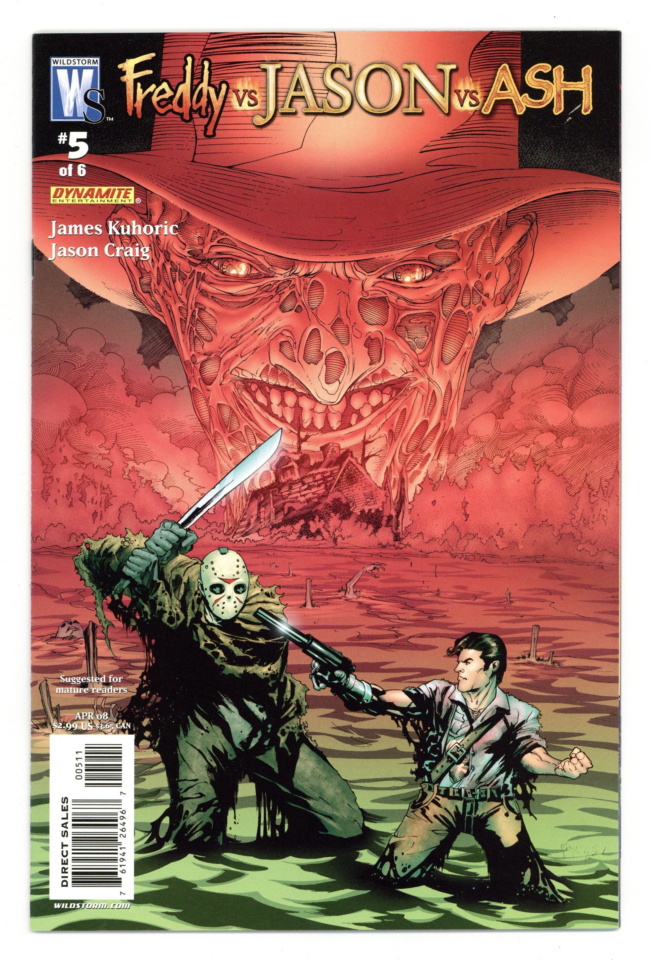 Published Apr 2008 by DC/Wildstorm.$26.00Story by Jeff Katz Written by James Kuhoric Art by Jason Craig Cover by Richard Friend The Necronomicon's demonic passages freed Freddy from the black hole of Jason's subconscious and granted him the power to manipulate reality just like the dreamscape. Jason is being dragged down by hundreds of zombies - victims - from his reign of slaughter. And Ash is stuck in the middle trying desperately to get the book, say the words, and send the two monsters back to hell. It's the non-stop battle royale horror fans have clamored for between the immovable object, the unstoppable force, and the wiseass retail clerk! The horror movie cross-over event of the century rages on! Co-published with Dynamite Entertainment. Cover price $2.99.