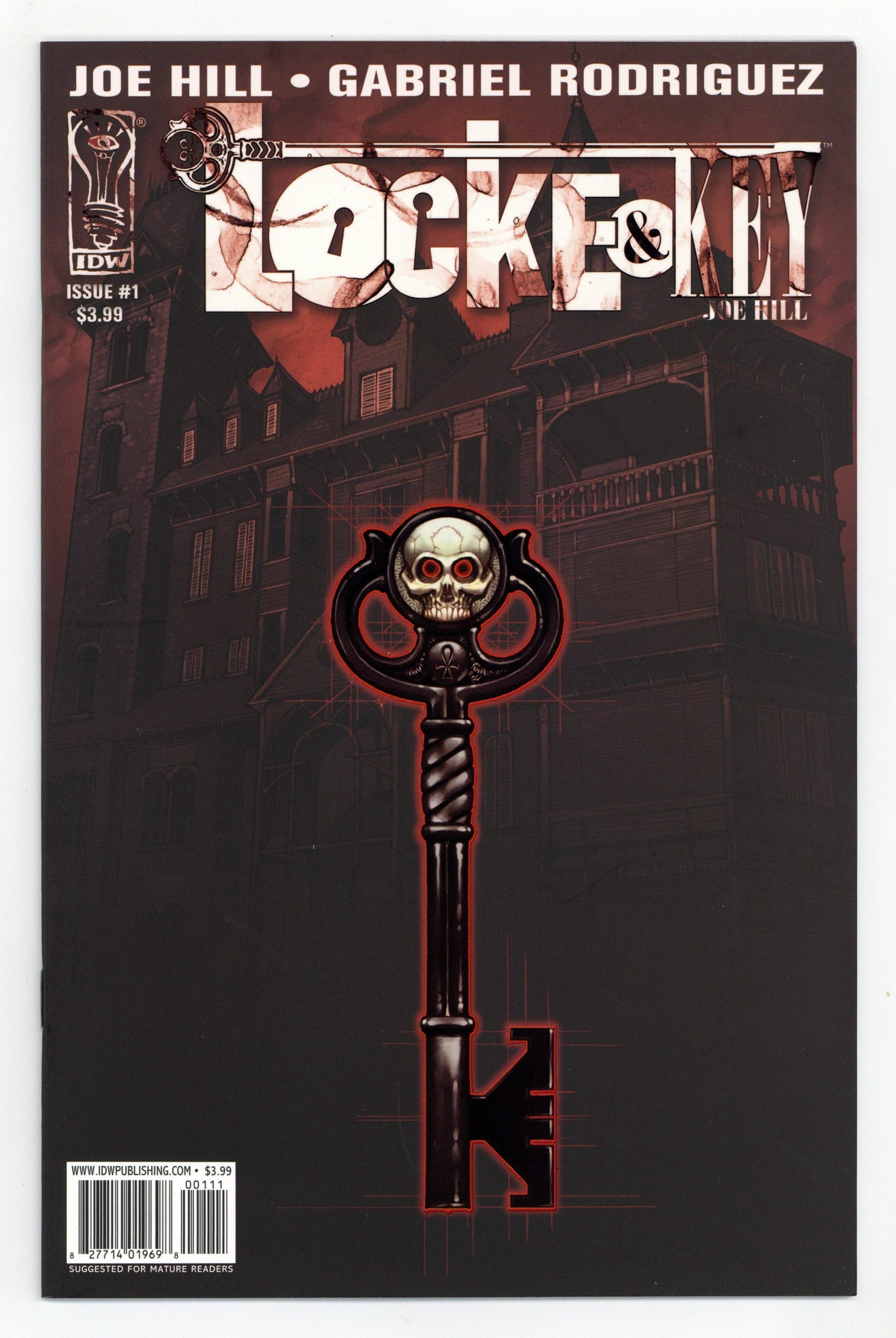Published Apr 2008 by IDW Publishing.$25.00Second Printing. Joe Hill (w); Gabriel Rodriguez (a & c) Acclaimed suspense novelist and New York Times best-selling author Joe Hill (Heart-Shaped Box) creates an all-new story of dark fantasy and wonder: Locke & Key. Written by Hill and featuring astounding artwork from Gabriel Rodriguez (Clive Barker's The Great and Secret Show, Beowulf), Locke & Key tells of Keyhouse, an unlikely New England mansion, with fantastic doors that transform all who dare to walk through them.... and home to a hate-filled and relentless creature that will not rest until it forces open the most terrible door of them all... Cover price $3.99.