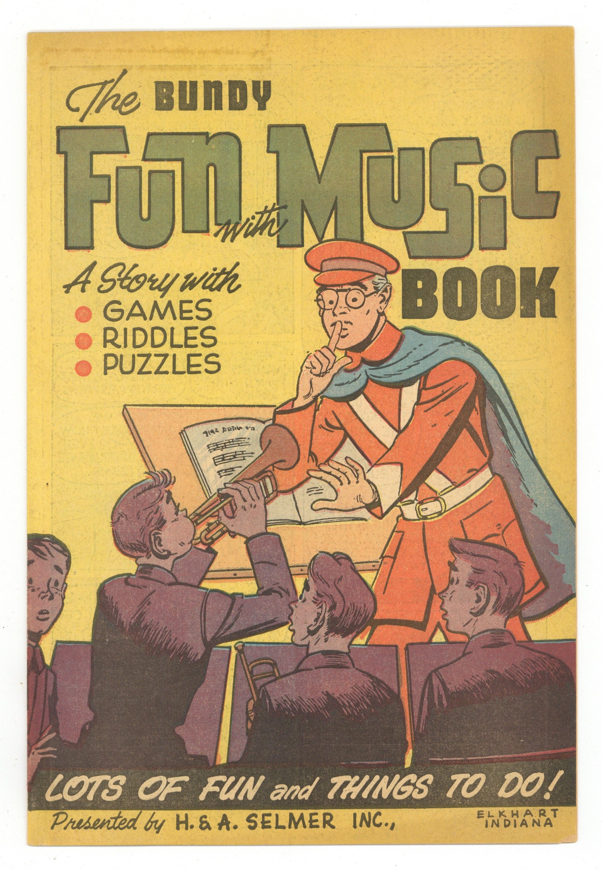 Published 1962 by Selmer Division of Magnav.$6.80Bundy Fun with Music Book (1962) was promotional comic book distributed by the Selmer Division of Magnavox Company. Young Ann and David Webb start their first day at a new school by meeting the music teacher and learning about instruments and the role of music throughout history. Includes games, riddles, and puzzles. 16 pages, full color, newsprint, 7-in. x 10-in.