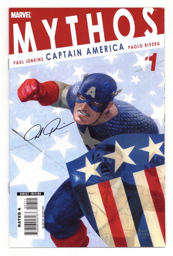 Written by PAUL JENKINS Art and Cover by PAOLO RIVERA He may be dead, but now you can find out how the man became the legend! Mythos revisits Steve Rogers' transformation from a weakling with a heart of steel to the Sentinel of Liberty! From the mind of Paul Jenkins' and the stunning art of Paolo Rivera comes the origin of CAPTAIN AMERICA! 32 PGS./Cardstock Cover/Rated A Cover price $3.99.