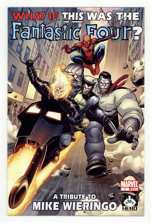 Tribute to Mike Wieringo. by Parker, Wieringo, Kesel, Staples & Various Before artist Mike Wieringo passed away, he had completed seven pages of a What If? story featuring the 'replacement' Fantastic Four: Spider-Man, the Hulk, Ghost Rider and Wolverine! Marvel Comics generously donated the script and Mike's art to The Hero Initiative. Mike's talented friends and fans stepped up to finish the story, and pay tribute to Mike in this great tale! This awesome 48-page book contains the full story, and additional written tributes to Mike, and includes artists Arthur Adams, Paul Renaud, Stuart Immonen, Cully Hamner, Alan Davis, Brian Stelfreeze, David Williams, Sanford Greene, Humberto Ramos, Skottie Young, Mike Allred, and Barry Kitson. Cover by Mike Wieringo and Paul Mounts. This benefit for The Hero Initiative is published with the full approval of Marvel Comics, and on the advice and consent of the family of Mike Wieringo. Cover price $4.99.