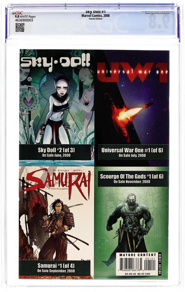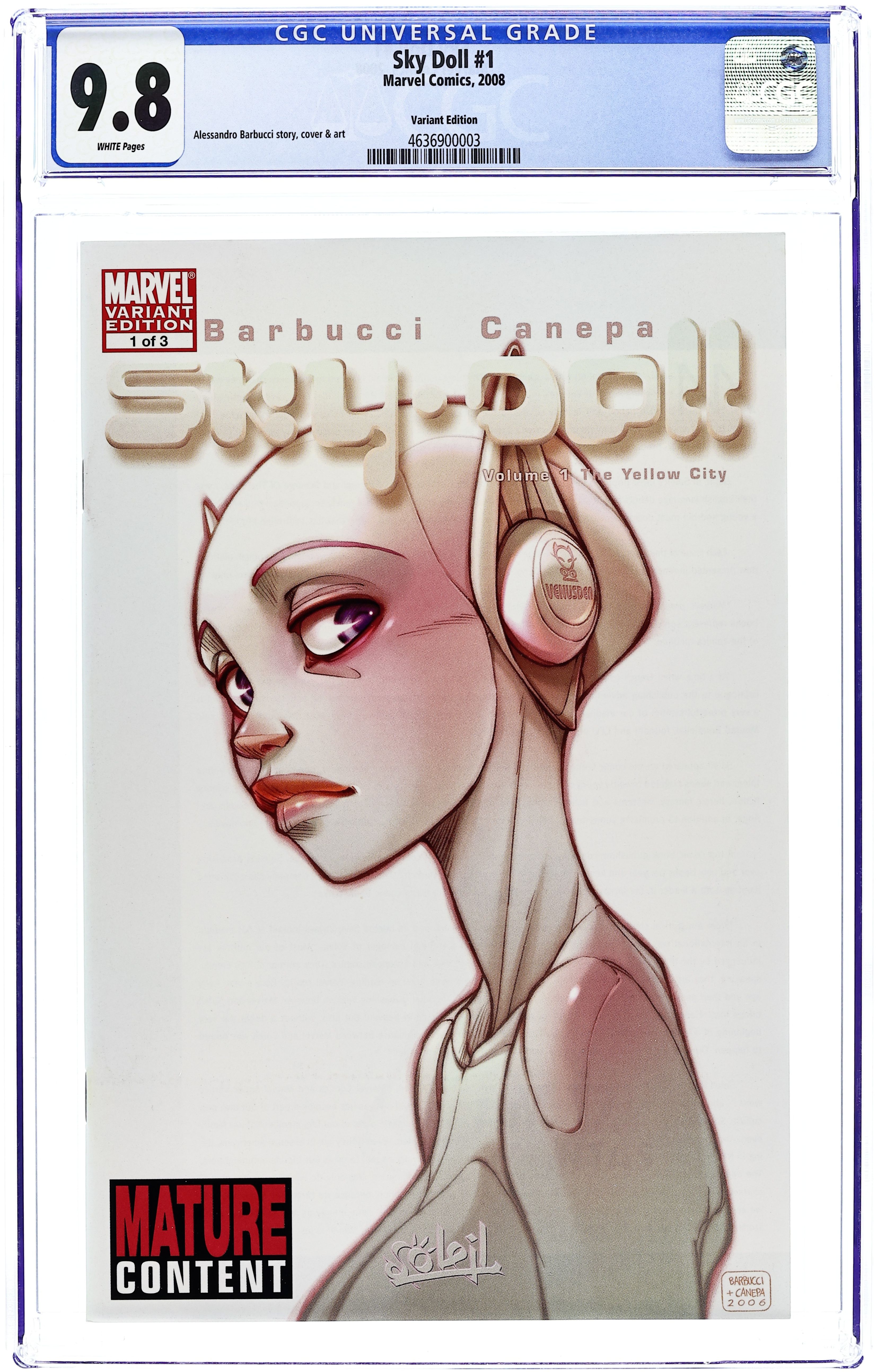 Exclusive U.S. ONLY Variant Cover by ALESSANDRO BARBUCCI. Written by BARBARA CANEPA Art by ALESSANDRO BARBUCCI The internationally acclaimed best-seller is now finally presented in English! Meet Noa, a so-called Sky Doll; a life-like female android without rights, who exists only to serve the State's needs and desires. But when Noa meets two so-called 'missionaries' who aid in her escape from her tyrannical master, all hell breaks loose for our cyborg siren as she uncovers clues that she may be much more than just a robotic toy. The first release in a new partnership between Marvel and cutting-edge French publisher Soleil! 64 PGS./Mature Content ...$5.99 The Soleil Comics may only be sold in English North America: United States, Canada, Mexico and their territories and possessions. Cover price $5.99.