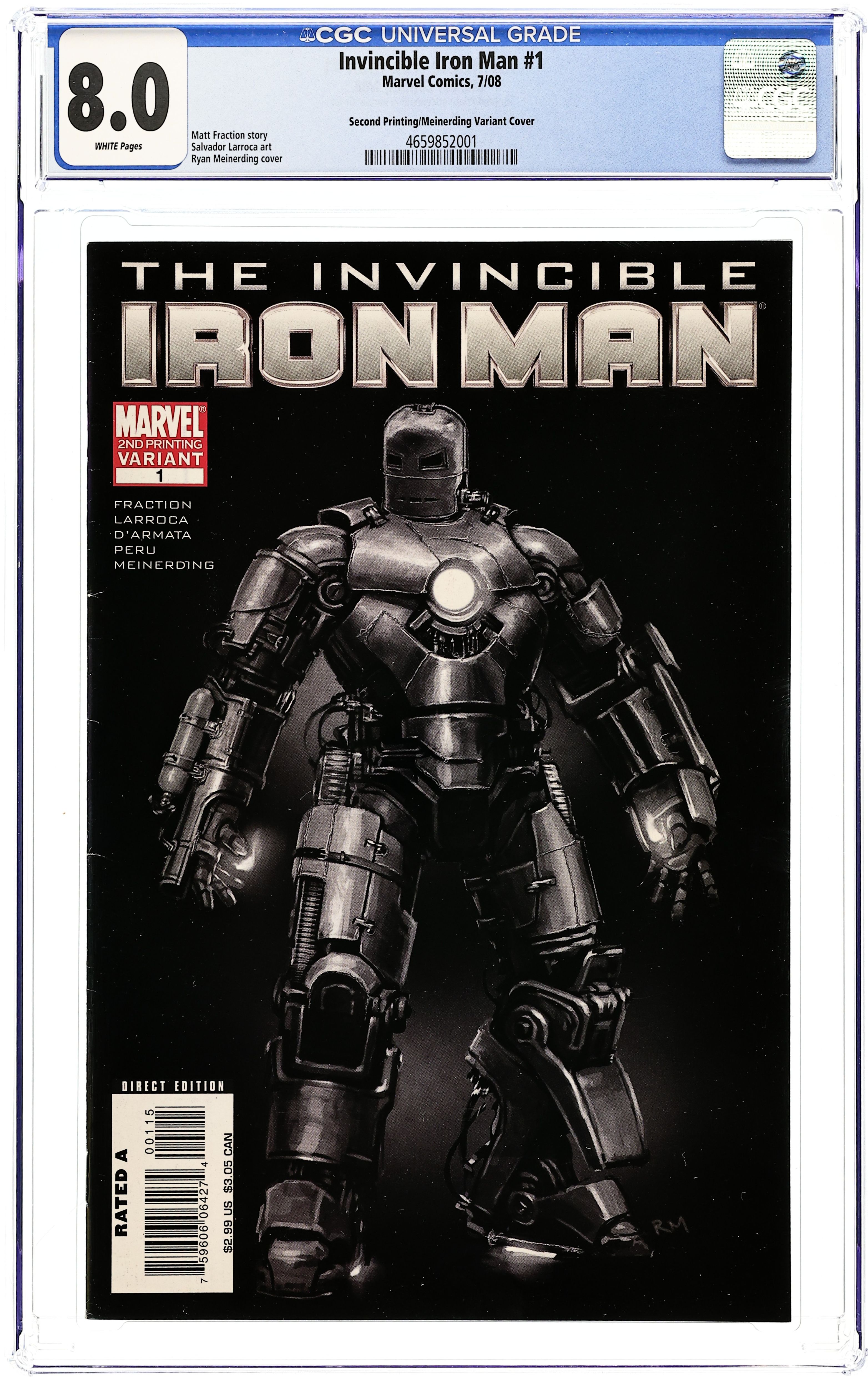 2nd Printing Variant Cover by Rick Meinerding. The Five Nightmares: Part 1 of 6 - Written by MATT FRACTION Pencils by SALVADOR LARROCA. A bold new ONGOING TITLE for the biggest hero of 2008! IRON MAN! You know you love him! And as the summer's most anticipated movie boot-jets its way into theaters, here's the perfect jumping-on point for new readers and Iron Man fans alike! Tony Stark - Iron Man, billionaire industrialist and director of S.H.I.E.L.D. - faces the most overwhelming challenge of his life. Ezekiel Stane, the son of Tony's late business rival and archenemy Obadiah, has set his sights, his genius and his considerable fortune on the task of destroying Tony Stark and Iron Man. What's worse, he's got Iron Man tech, and he's every bit Iron Man's equal and opposite...except younger, faster, smarter...and immeasurably evil. Rising star writer Matt Fraction (IMMORTAL IRON FIST) and superstar artist Salvador Larroca (UNCANNY X-MEN) join forces to repulsor-ray your comic books to a cinder! 32 PGS./Rated A ...$2.99 Cover price $2.99.