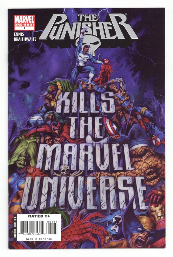 Direct Marketing edition with $4.99 cover price. Written by GARTH ENNIS Pencils & Cover by DOUGIE BRAITHWAITE Reprinting Garth Ennis' first shot at writing the Punisher! What happens when Frank Castle's wife and kids are caught in the crossfire of a super-hero battle instead of a gangland slaying? Find out in this alternate-reality tale from 1995, as Castle vows vengeance on a world full of Marvel heroes as the Punisher! 48 PGS./Rated T+ Cover price $4.99.