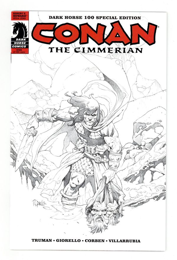 Published Jul 2008 by Dark Horse.$27.00Limited Edition Sketch Cover by Tomás Giorello. Timothy Truman (W), Tomás Giorello (P), Richard Corben (P/I), José Villarubia (C), Joe Kubert (Cover), and Frank Cho (Cover) On sale As hard as it's been for Conan to return to Cimmeria, things aren't getting any easier as he nears his goal, and he quickly runs afoul of raiders on the Cimmerian borderlands. One stranger welcomes Conan home with a crack to the head, and another begins to weave a tale about Conan's grandfather-another Cimmerian who was filled with wanderlust. Conan the Cimmerian continues Dark Horse Comics' modern revitalization of Robert E. Howard's most beloved character. This is a great jumping-on point for new readers-and our first look at the creative muscle that will fuel Conan's adventures throughout 2008! ? Legendary storyteller Joe Kubert contributes a rare variant cover for our first issue! ? The star-studded team of Timothy Truman, Tomás Giorello, José Villarubia, Richard Corben, and Frank Cho launch Conan into a whole new era! Dark Horse's acclaimed series surges forth into an exciting new era! FC, 40 pages Cover price $2.99.