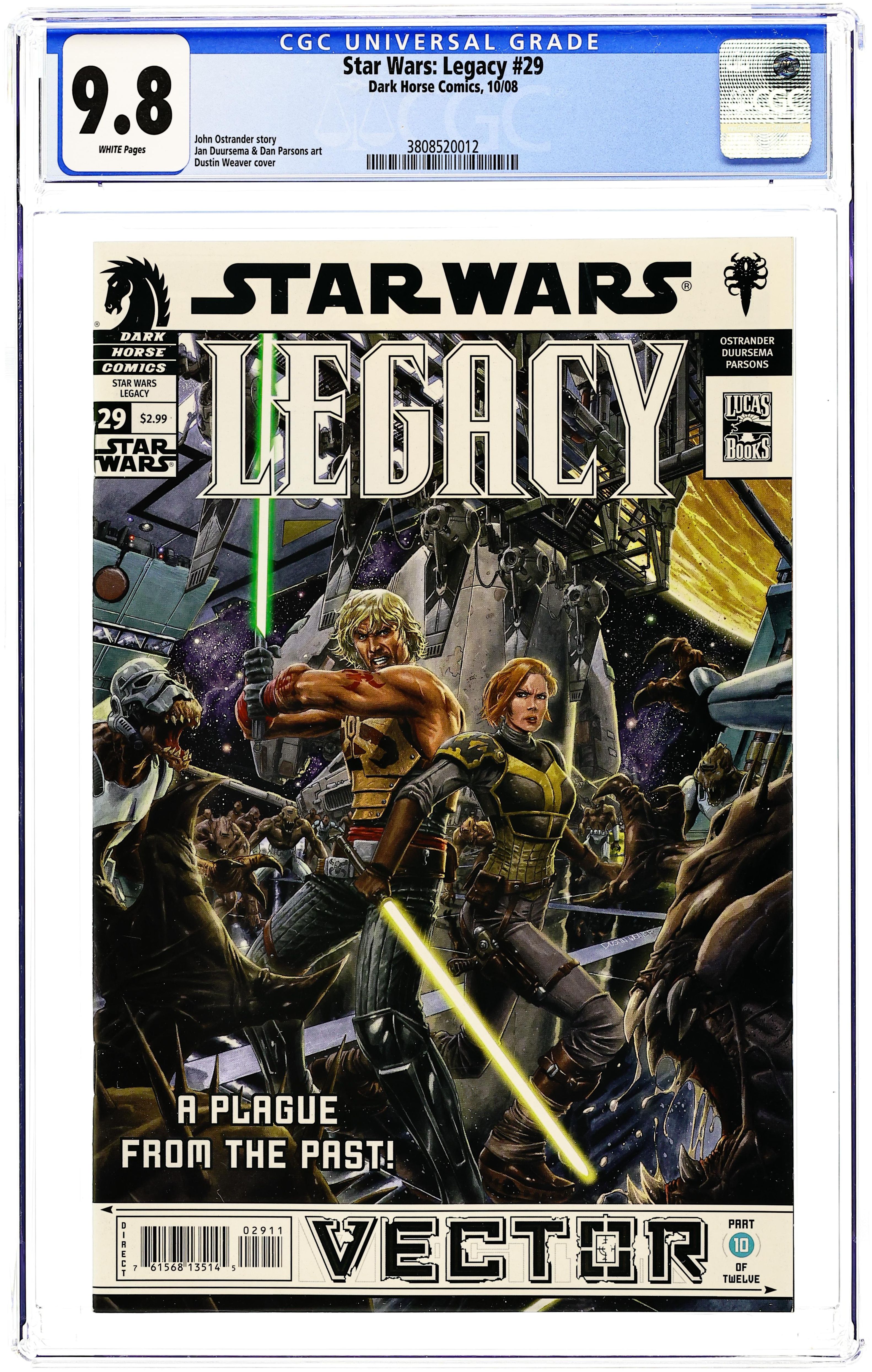 Vector: Part 10 of 12 - John Ostrander (W), Jan Duursema (P), Dan Parsons (I), and Dustin Weaver (C) With his bounty-hunter pals and a team of Imperial Knights, Cade Skywalker plans to assassinate the Sith Emperor Darth Krayt. The first step in their scheme requires a risky attack on a remote Imperial outpost in hopes of drawing Krayt away from Coruscant. But even if that works, members of the team are divided in their feelings about their 'secret weapon'-Celeste Morne, an ancient Jedi Knight of the Old Republic who is in possession of-and possibly possessed by-the powerful Muur Talisman. As we plunge into the final chapters of the yearlong 'Vector' crossover, the power of the Talisman threatens to shake the galaxy to its foundations! FC, 40 pages Cover price $2.99.