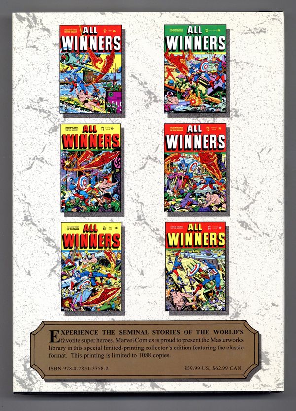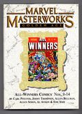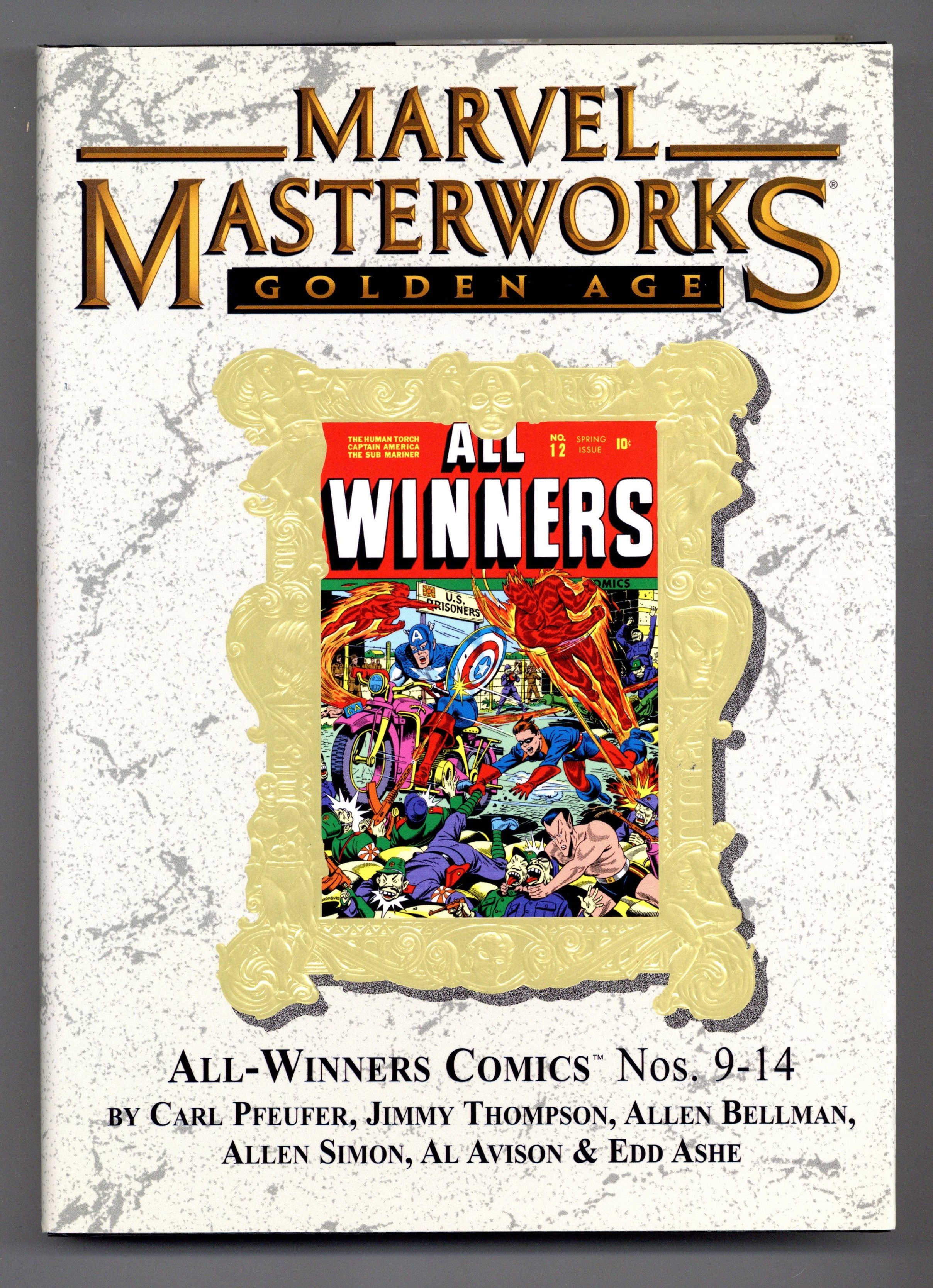 Volume 108 - 1st printing. "GOLDEN AGE: ALL-WINNERS" Collects All-Winners Comics (1941-1947) #9-14. Art by HARRY SAHLE, JIMMY THOMPSON, CARL PFEUFER, BOB OKSNER, GEORGE KLEIN, AL BELLMAN, VINCE ALASCIA, CHAD GROTHKOPF, DON RICO, AL FAGALY, ALEX SCHOMBURG, MIKE SEKOWSKY, ALLEN SIMON and AL GABRIELE. Cover by ALEX SCHOMBURG. Introduction by Roy Thomas. It's the titanic trio of the Timely Big Three - Captain America, the Human Torch and the Sub-Mariner - combined with Golden Age luminaries the Destroyer and the Whizzer in one all-out amazing series! Defending wartime America from Nazi airships, ape-men and anything and everything else the Axis can throw at them, the Human Torch and Toro burn up the comic page like it's still 1943. Captain America and Bucky parachute into adventures from mad scientists to buzz-bombing Nazis. Meanwhile, the Destroyer stops at nothing - including a battalion of Hitler impersonators - to stop the Nazi threat. And the Pacific Theatre won't be left waiting, not with the Sub-Mariner around! He takes it straight to the Emperor himself and comes back to clean up the docks while he's at it! But before you speed away, don't miss the Whizzer as he races through maddening mazes and thwarts the plans of kidnapping crooks! It's comic-book adventure at its purest, so reserve your copy today! Hardcover, 304 pages, full color. Cover price $59.99.