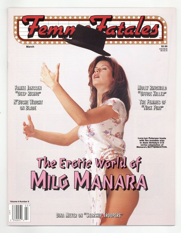 Published Mar 1998 by Frederick S. Clarke.$21.00Volume 6 - #9 - March 1998. The Erotic World of Milo Manara. Plus: Famke Janssen in Deep Rising, N'Bushe Wright in Blade, Molly Ringwald in Office Killer, the Femmes of Nick Fury, Dina Meyer on Starship Troopers. Cover features adaptation of Manara's Butterscotch. Cover price $5.99.