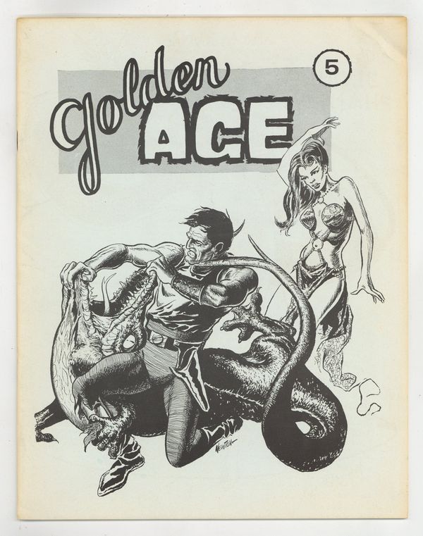Published by the S.F.C.A., The Golden Age was an important fanzine published during the height of comic book fandom. Issue #5 includes: an article about lagging comics sales by Max Kerpelman; a pin-up of The Blonde Phantom; The Horror of EC featuring reprinted art by Graham Ingels and Jack Davis; a feature on Top Notch Comics; The Rockets of Mongo strip, with layouts by Mike Royer; a Catman center spread by Don Newton; In Retrospect (regarding the first 31 years of super-heroes) by Howard P. Siegel, featuring reprinted art of Captain Triumph, Yellowjacket, and Kid Eternity; a reprinted newspaper article about Cary Bates; a reprinted newspaper article about Forry Ackerman; a pin-up of The Phantom by Richard Buckler; and more. Cover art by Don Newton. 28 pgs. Cover price $1.50.