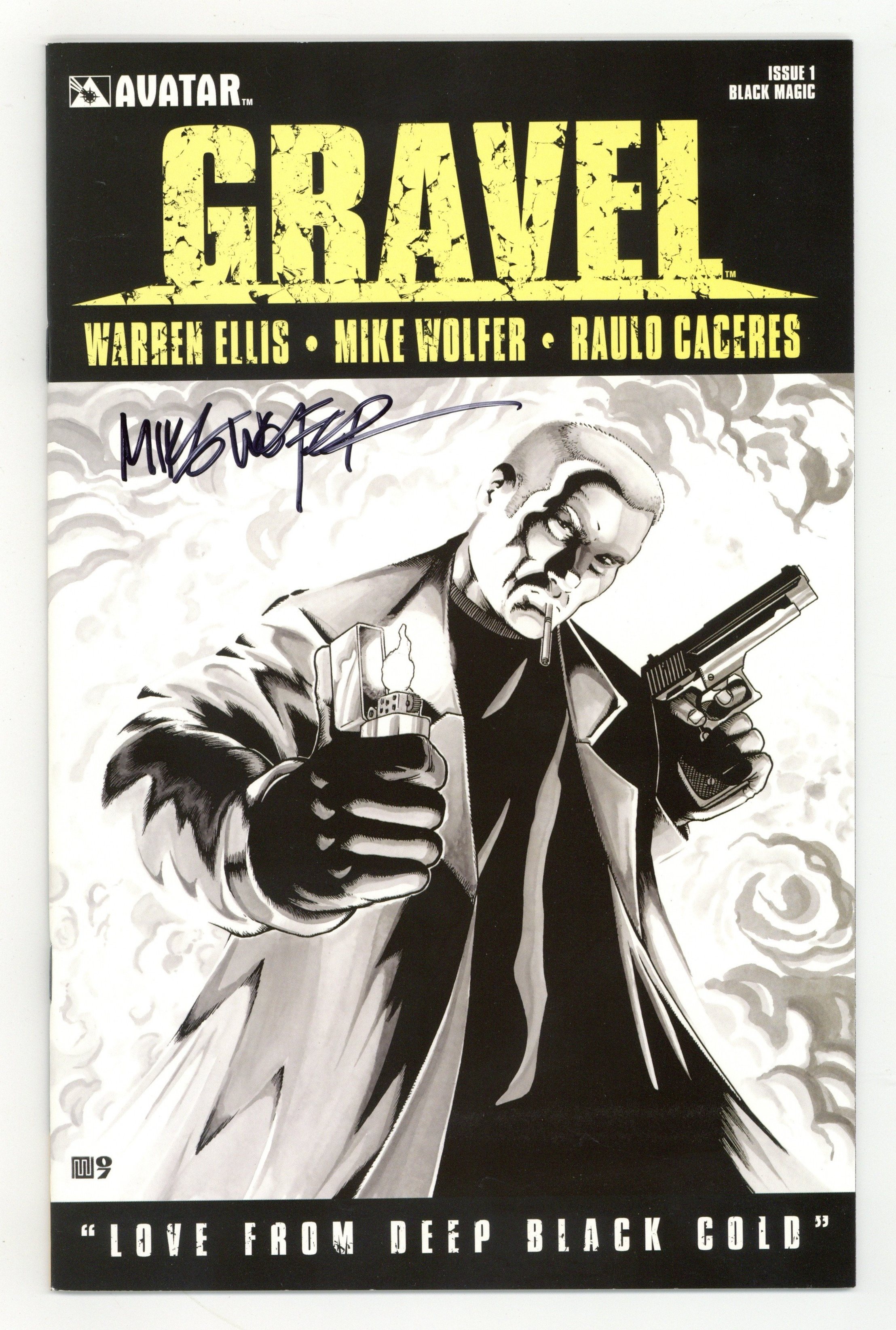 Limited Edition Black Magic Variant Cover by Mike Wolfer. by Warren Ellis, Mike Wolfer & Raulo Caceres It's never a dull day, being a Magician. The mad mind of Warren Ellis is once again unleashed on combat magician William Gravel, this time on a full-color, on-going monthly series! Magic. Everyone thought that he was dead, including the Minor Seven, the secret enclave of Britain's Occult Detectives. But Combat Magician William Gravel is very much alive and looking for the answers to how and why his place in the Minor Seven was filled by another and what the secret society is doing with the Sigsand Manuscript, an ancient supernatural text of unparalleled power. In a quiet, country cottage, Gravel will find the first clues to the Sigsand's location and in the darkness of the cottage's basement, a disturbing, unnatural thing that slithered into our dimension by the power of the ancient tome... Brought here from somewhere that mortal man could not possibly comprehend. The kind of magic that can strip the skin from a screaming man's skull, or direct the path of a shrieking bullet through a maze of city streets, striking its target between the eyes with pin-point accuracy. This is not just magic... This is Combat Magic, wielded by Sergeant Major William Gravel, Warren Ellis' cult-hit sensation from the pages of Strange Kiss and Strange Killings, now in his own, ongoing, full-color monthly series! This issue is available with a regular cover by Mike Wolfer, a wraparound by Raulo Caceres, a special Signed Poster edition package with a color poster of the #0 cover signed by artist Mike Wolfer, and also a rare 1-in-15 'Black Magic Edition' featuring a new cover by Wolfer. Cover price $3.99.