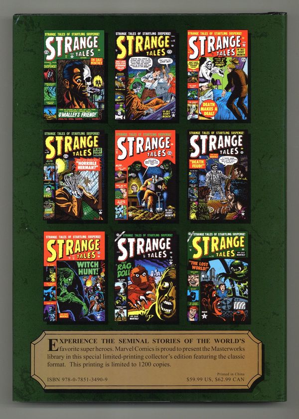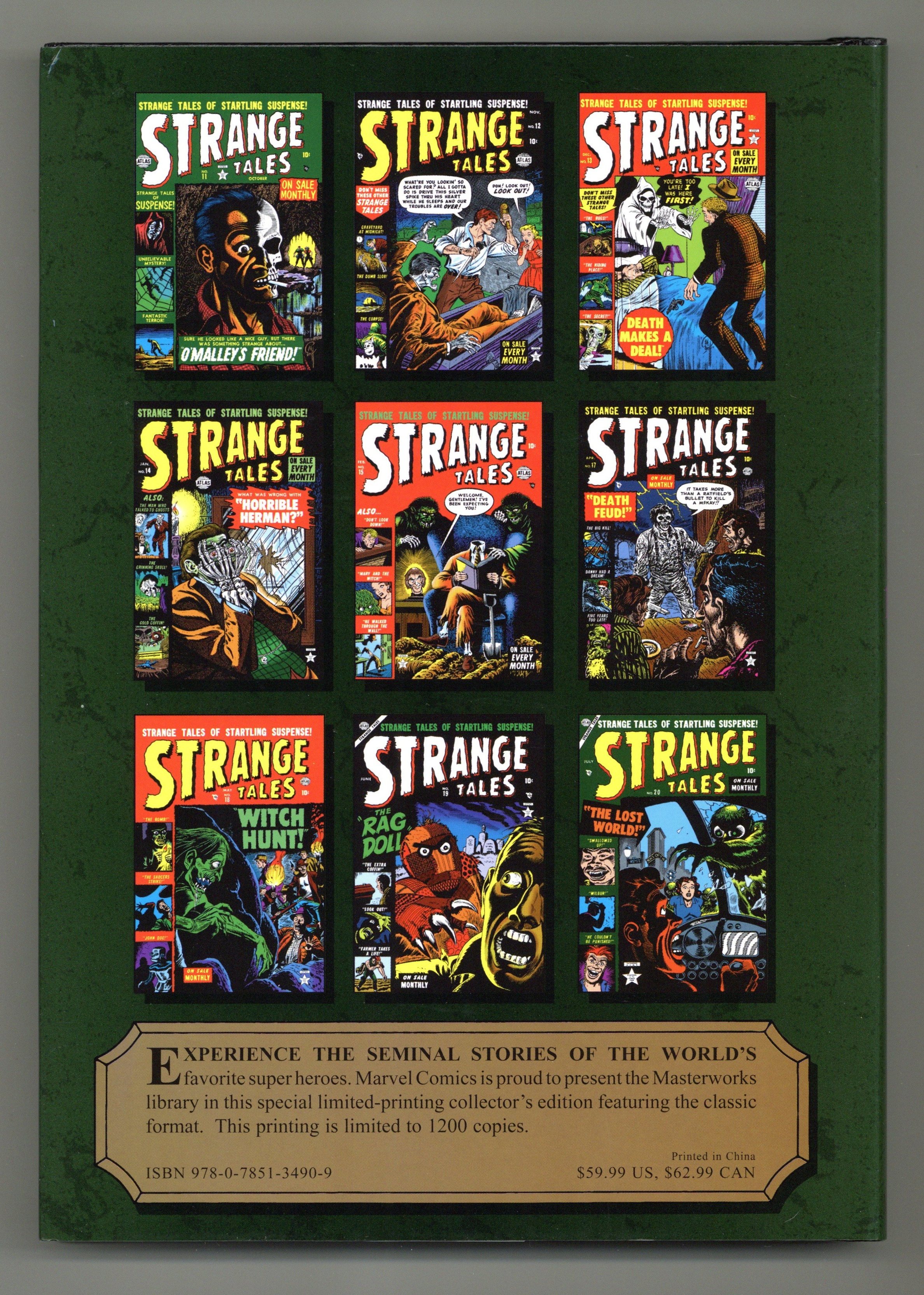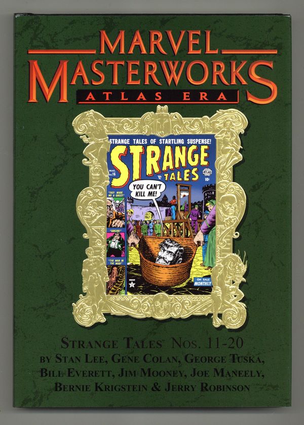 Volume 113 - 1st printing. "ATLAS ERA: STRANGE TALES" Collects Strange Tales (1951-1976 1st Series) #11-20. Written by STAN LEE. Art by BILL EVERETT, GENE COLAN, JOE SINNOTT, BERNIE KRIGSTEIN, JOE MANEELY, JERRY ROBINSON, JIM MOONEY, GEORGE TUSKA, PAUL REINMAN, HARRY ANDERSON, TONY DIPRETA, ED WINIARKSI, SAM KWESKIN, and DICK BRIEFER. Cover by HARRY ANDERSON. Join the Marvel Masterworks as we take another dip into the well of pre-Code madness from the era when comics were no-holds-barred and horror was king! You'll be treated to dozens of tales from the dark side by such luminaries as Bill Everett, Gene Colan, Bernie Krigstein, Jerry Robinson and many, many more as they dig up the deepest, darkest tales of suspense and terror found anywhere this side of a mortuary. The Farmer takes a life, but what price will he pay when the chickens come home to roost? Is O'Malley's friend really the kind of guy you want to hang out with? Find out what makes even a monster afraid, and discover the sure-fire solution to father-in-law trouble! The 1950s were a time of gruesome stories and great art, and Stan Lee's Atlas had it all. What more can we say? The devil made us do it! Reserve that copy today! Hardcover, 272 pages, full color. Cover price $59.99.