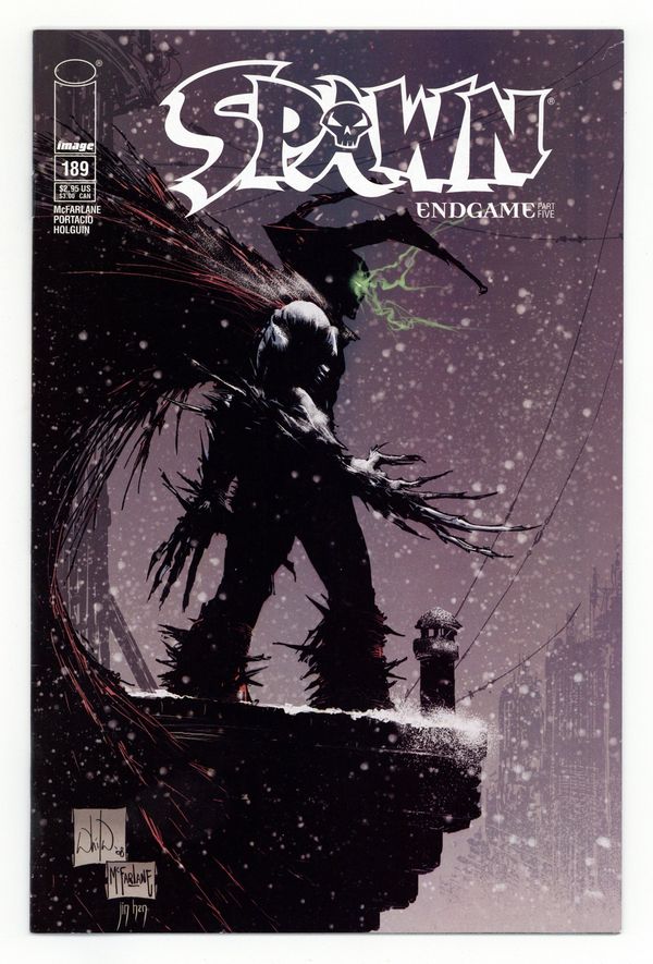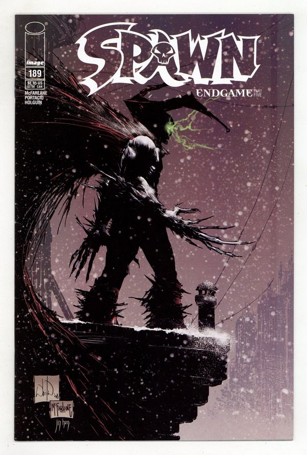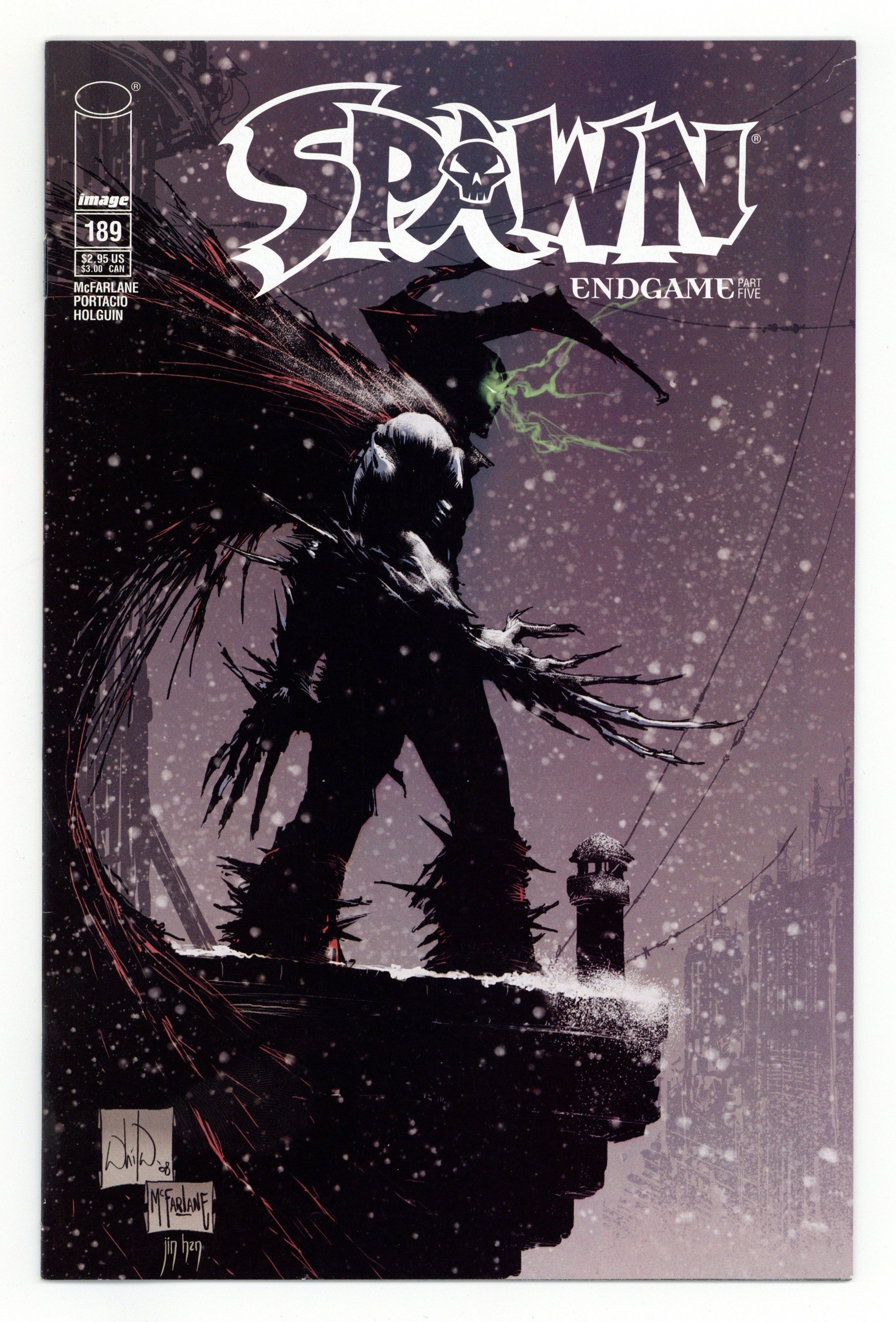 Cover by Whilce Portacio. Endgame: Part 5 - story TODD McFARLANE & BRIAN HOLGUIN art WHILCE PORTACIO & TODD McFARLANE colors JIN HAN Jim continues to struggle to remember his past while trying to come to terms with the dark power that now dwells within him. Wrestling for control with the Spawn entity, he soon discovers that power is not corrupting, it's addictive. Brought to you by the all-star team of TODD McFARLANE, WHILCE PORTACIO and BRIAN HOLGUIN. 32 PAGES FC Cover price $2.95.