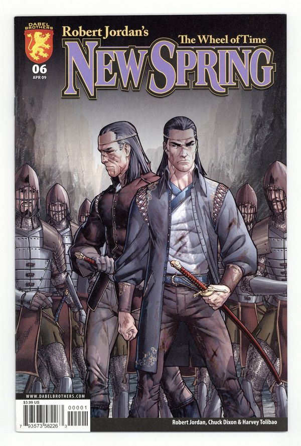 Published Apr 2009 by Dabel Brothers Production.$18.00Written by Chuck Dixon, and Robert Jordan. Art by Harvey Tolibao. New Spring is a graphical adaptation of the best-selling prequel to Robert Jordan's acclaimed fantasy series, The Wheel of Time. The New Spring comic series, which is 8 issues long, was started in 2005 and was published up through issue #5. In 2009 Dabel Brothers will be completing the series by publishing issues 6 through 8. In this issue, entitled 'The Deeps', Al'Lan Mandragoran, uncrowned king of the lost nation Malkier, makes his way to the city of Chachin. He is chasing a rumor that Lady Edeyn, a woman from his past, intends to lead a crusade of warriors in an effort to reclaim his lost country from the Blight. Unexpectedly, his journey will lead him to Moiraine who is on a crusade of her own, a secret and desperate search for a child born of prophecy. The Dragon has been reborn in the world and the fate of all will rest on the shoulders of those who find him. Cover price $3.95.
